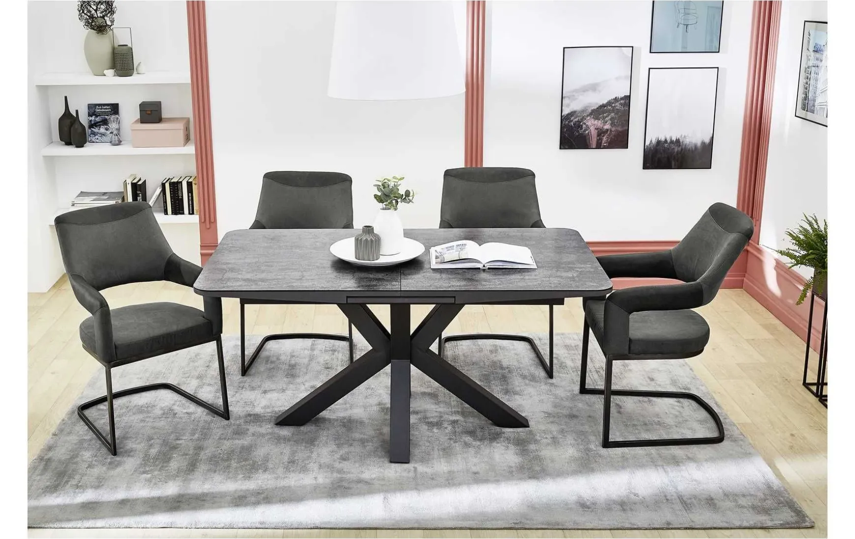 Der moderne Schwingstuhl mit Anthrazit farbenen Stoffbezug in Lederoptik zuammen mit seinem Schwinggestell machen jeden Essbereich modern.