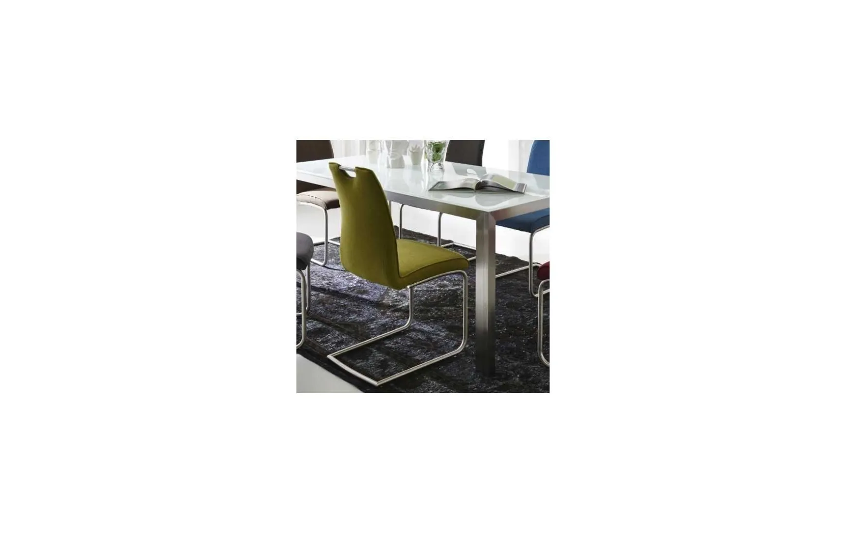 Der Grüne Schwingstuhl mit stabilen Edelstahlgestell bringt frischen Wind in Esszimmer und Wohnstube. Das moderne Design des Freischwingers wird neben den Grünen Bezug durch ein stabiles Edelstahlgestell ergänzt. Die Sitzfläche ist mit einer Wellenfederung gepolstert und daher sehr bequem. Dank dem Edelstahlgriff in der Rückenlehne kann der stabile Schwingstuhl auch problemlos von einem Raum in den anderen getragen werden.
