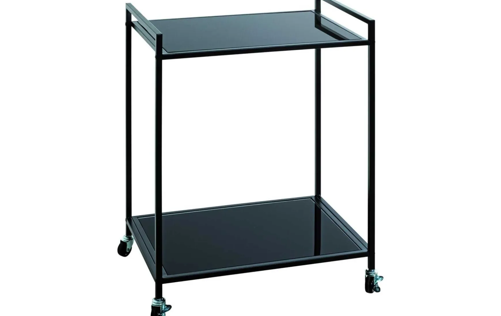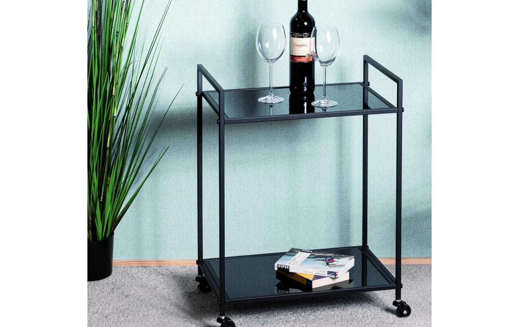 Der moderne Servierwagen überzeugt mit einer eleganten Ablage aus schwarzem Sicherheitsglas und einem stabilen Gestell aus schwarz lackiertem Stahlrohr. Dank der praktischen Zwischenhöhen von ca. 8,5 cm und 51,5 cm bietet er ausreichend Platz für Getränke, Geschirr oder Dekoration und lässt sich vielseitig im Wohn- oder Essbereich einsetzen.