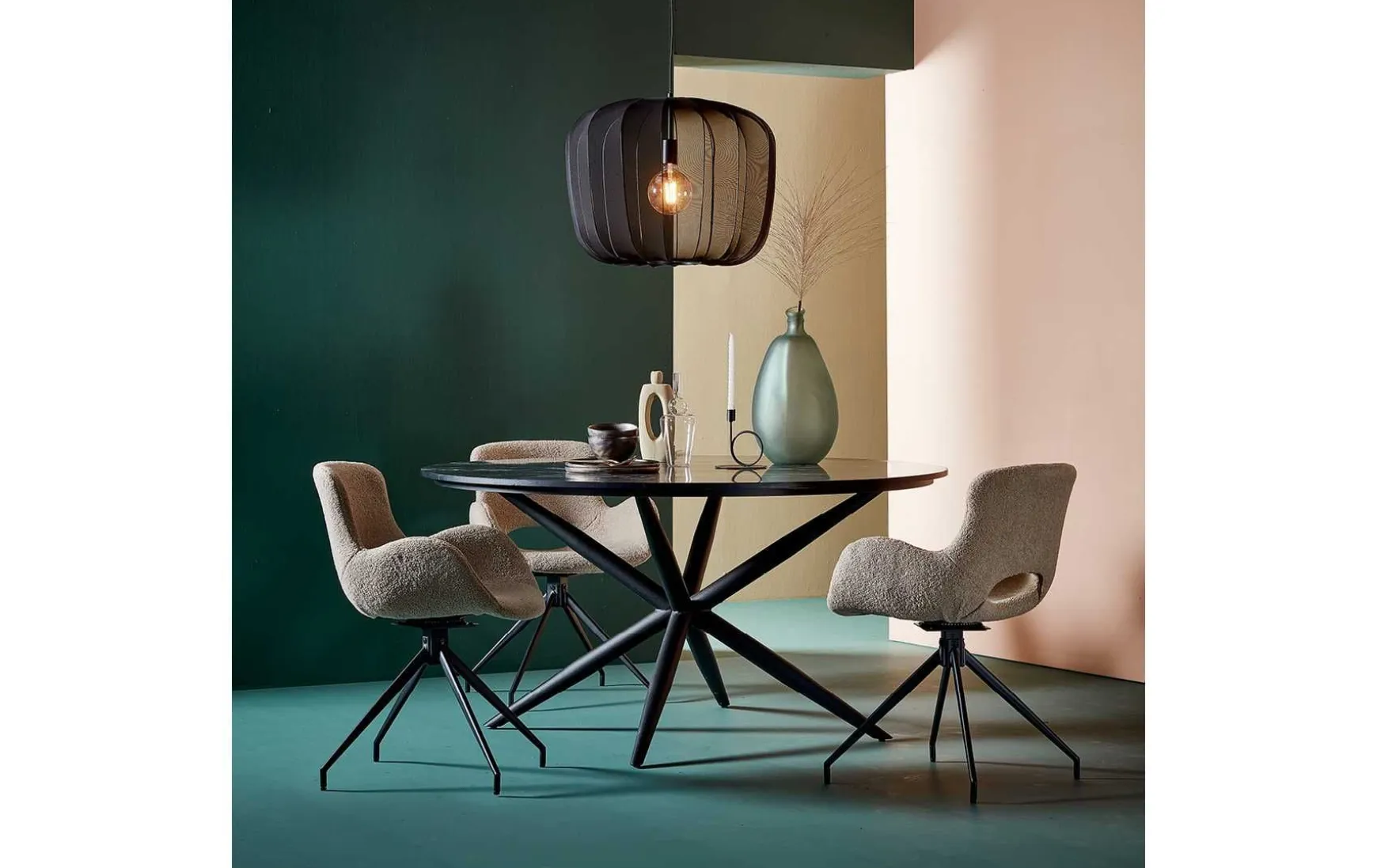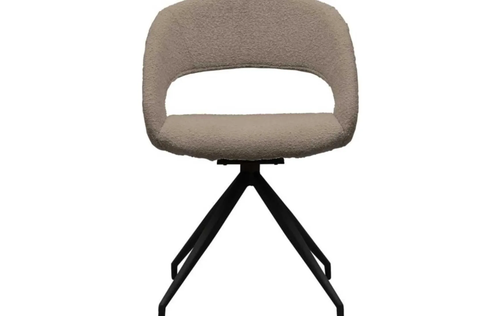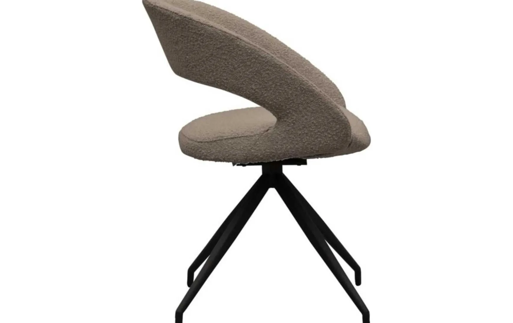 Hübsch! Dieser Esszimmerstuhl ist ein attraktiver und einzigartiger Esszimmerstuhl mit einer coolen Sitzfläche, einem trendigen Bouclé-Stoff und einem drehbaren Bein mit schwarzem Finish. Einzeln schön, aber in Kombination fantastisch!