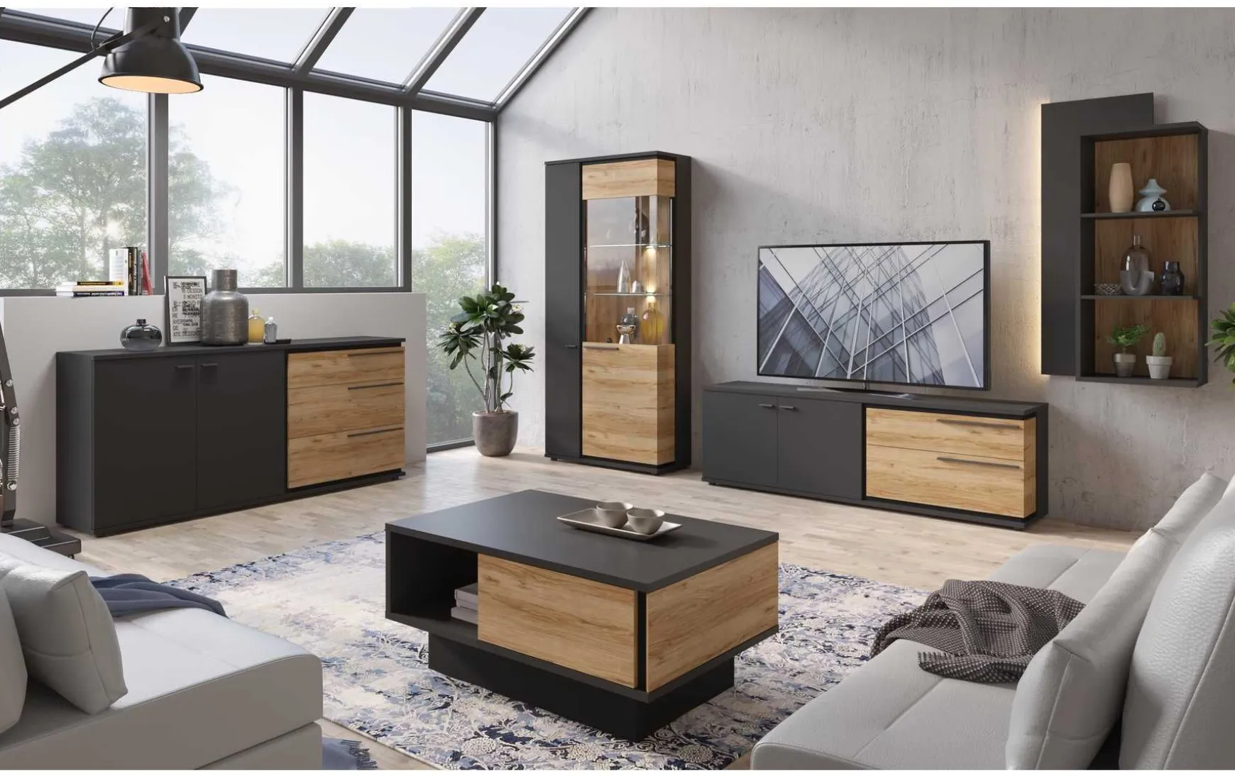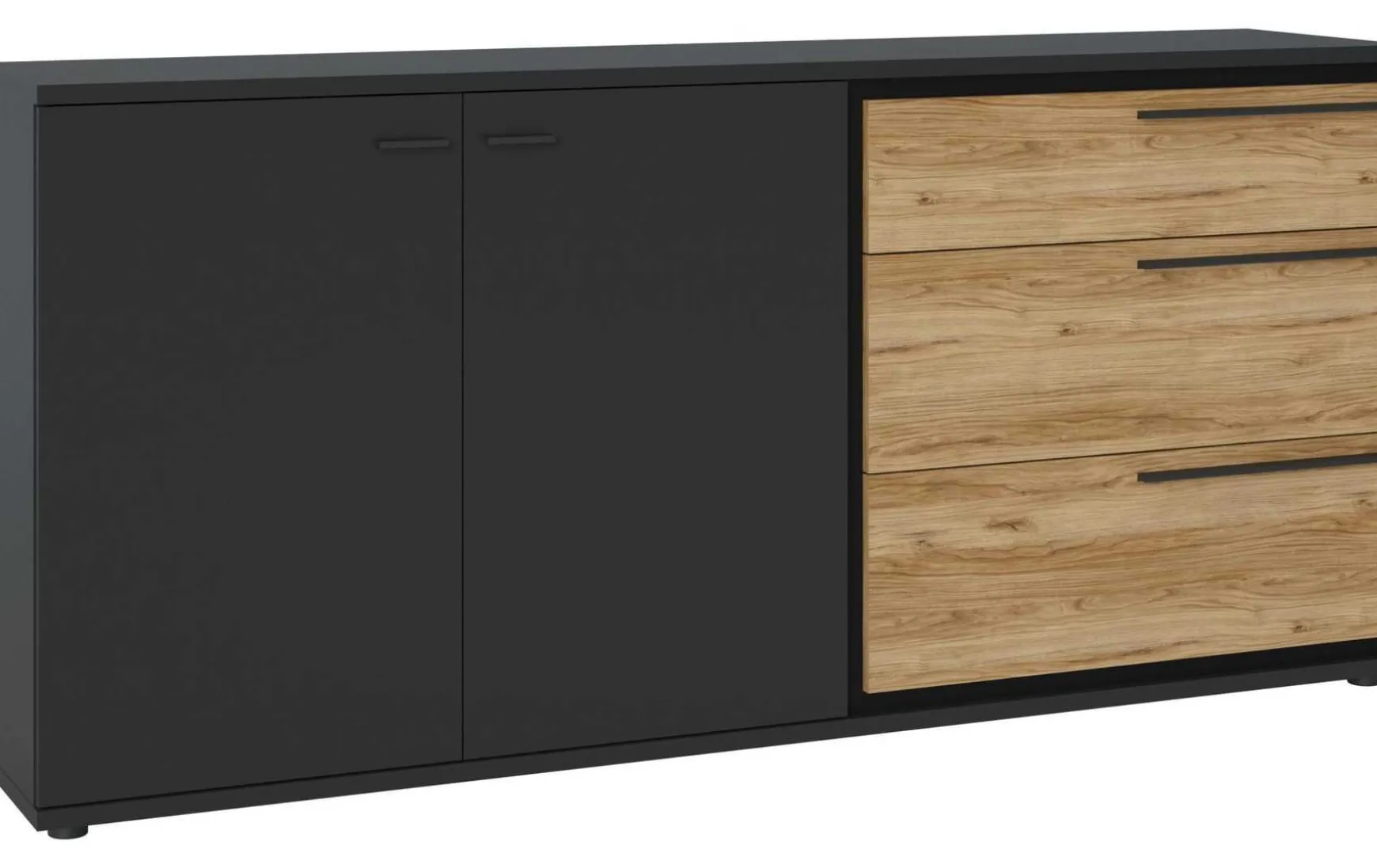 Diese moderne Kommode in Kosmos Grau und Catania Eiche überzeugt durch ihr zeitloses Design und praktische Funktionalität. Mit zwei Türen, drei Schubladen und mehreren Einlegeböden bietet sie viel Stauraum für Wohn- oder Essbereich. Dank der integrierten Soft-Close-Funktion schließen Türen und Schubladen besonders leise und komfortabel, während die pflegeleichte Dekoroberfläche den Alltag erleichtert.