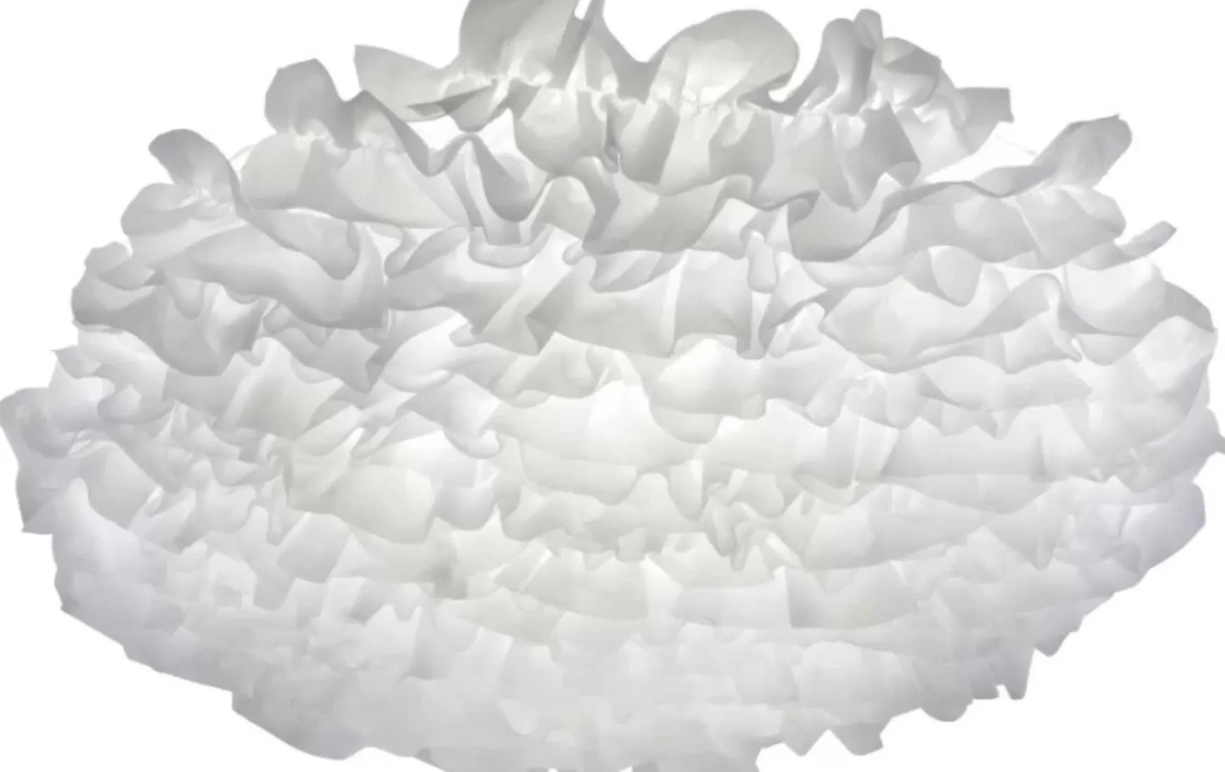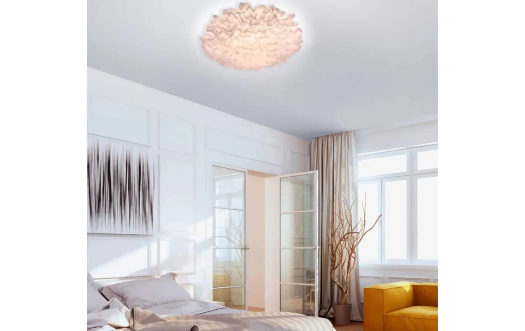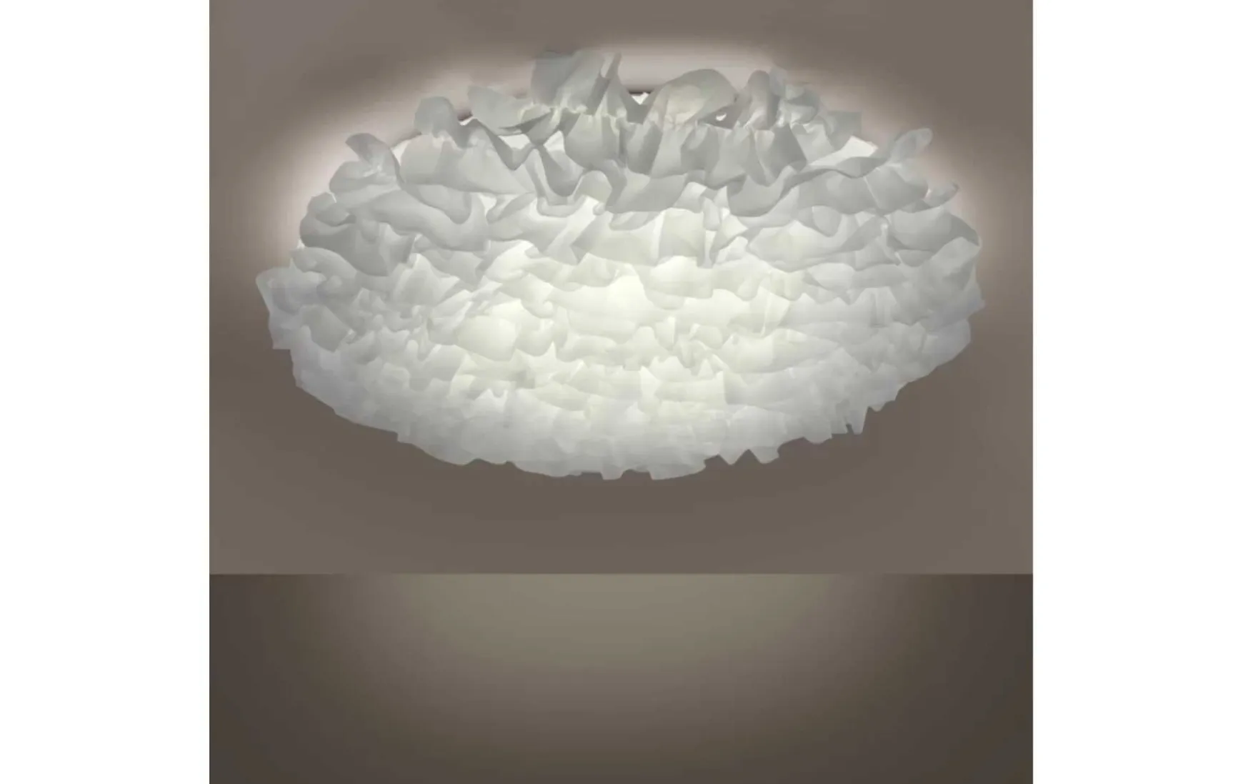 Diese LED-Deckenleuchte mit weißem Stoffschirm begeistert mit ihrer kunstvollen Optik. Das Lichtbild ist recht eindrucksvoll, denn die Überlappungen bewirken, dass das Licht an manchen Stellen dunkler, an anderen Stellen heller ist. Die Leuchte wird inklusive einem fest verbauten 51,80 Watt LED-Leuchtmittel geliefert. Mit der mitgelieferten Infrarotfernbedienung, welche sofort einsatzbereit ist, können Sie die Farbtemperatur des Lichts von warmweiß (2.700 Kelvin) bis tageslichtweiß (5.000 Kelvin) individuell steuern und somit die Lichtfarben eines Tagesablaufs simulieren. Neben der Tageslichtregulierung und der Helligkeitseinstellung ist die Leuchte ebenso in den Farben RGB zu schalten welche es ermöglichen, einzelne Lichtmodi wie Kaminfeuer oder Sonnenuntergang nachzubilden.