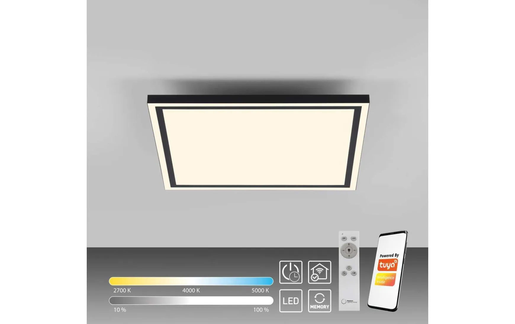 Erleben Sie die Zukunft der Beleuchtung mit unserer revolutionären LED Deckenleuchte. Mit ihrem modernen Design und innovativen Funktionen setzt sie neue Maßstäbe in Sachen Komfort und Flexibilität. Die LED Deckenleuchte in elegantem Schwarz vereint Stil und Funktionalität auf höchstem Niveau. Das quadratische Design fügt sich nahtlos in jeden Raum ein und verleiht ihm eine zeitgemäße Atmosphäre. Mit dem integrierten LED-Board und der CCT-Steuerung von 2700 bis 5000 Kelvin können Sie die Farbtemperatur ganz nach Ihren Bedürfnissen anpassen. Von warmweißem Licht für entspannte Abende bis hin zu kaltweißem Licht für konzentriertes Arbeiten – die Wahl liegt in Ihren Händen. Dank der mitgelieferten Infrarot-Fernbedienung haben Sie die volle Kontrolle über die Beleuchtung. Sie können nicht nur die Helligkeit stufenlos dimmen, sondern auch die Farbtemperatur individuell einstellen. Schaffen Sie eine Atmosphäre, die perfekt zu Ihrer Stimmung und Aktivität passt. Die Deckenleuchte ist auch Smart Home-fähig. Verbinden Sie sie mit der TUYA App und steuern Sie Ihre Beleuchtung bequem über Ihr Smartphone oder Tablet. Passen Sie die Farbtemperatur und Helligkeit nach Belieben an und speichern Sie Ihre bevorzugten Einstellungen mit der praktischen Memoryfunktion. Darüber hinaus ermöglicht Ihnen die TUYA App eine individuelle Zeitplanung und automatische Szenarien, um das Licht ganz nach Ihrem Tagesablauf anzupassen. Genießen Sie ein sanftes Aufwachen mit gedimmtem, warmweißem Licht oder schaffen Sie eine stimmungsvolle Atmosphäre für gemütliche Abende. Erleben Sie die Vielseitigkeit und Einfachheit der LED Deckenleuchte.