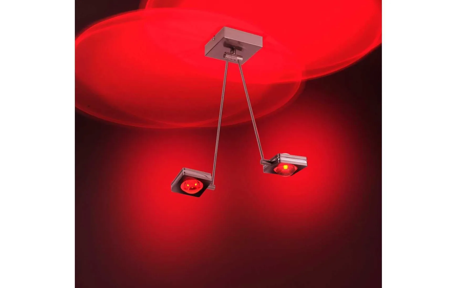 Mit dieser LED Deckenleuchte beleuchten Sie Ihre Räume besonders geschmackvoll. Die raffinierte Lampe, die aus Stahl, Metall und Glas besteht, verfügt über zwei um 320 Grad drehbare Spots, die eine individuelle Ausrichtung des Lichtes ermöglichen. Gleichzeitig ist die Zigbee-fähige Deckenlampe über die enthaltene Funk-Fernbedienung dimmbar. Wählen Sie darüber hinaus frei aus, in welche Farbe die Lampe Ihren Wohnbereich tauchen soll: Rot, Grün, Blau oder doch lieber klassisches Weiß? Steuern Sie die Farben der ca. 27 x 82 x 49 cm (BxHxT) großen Leuchte ganz einfach über eine Fernbedienung, eine Smartphone-App oder einen Tablet-PC. Die vier benötigten Led-Boards der Energieeffizienzklasse A++ mit je 3 Watt, 230 Lumen und 3000 Kelvin sind inklusive und nicht austauschbar.