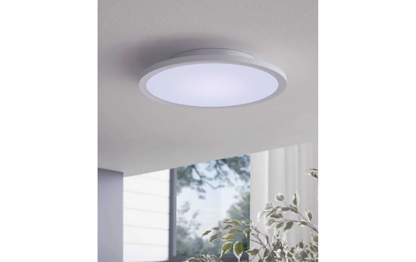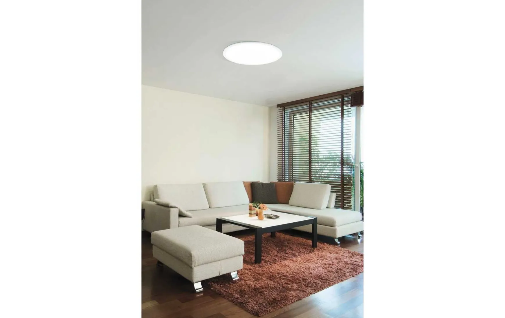 Die LED Deckenleuchte aus dem Smart Home Sortiment connect besteht aus einem runden, weißen Aluminium-Rahmen und einer Leuchtfläche aus weißem Kunststoff.