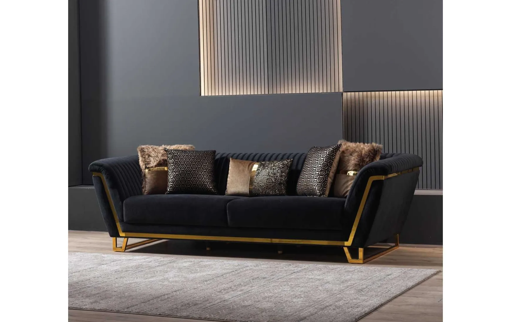- Elegantes Sofa in Schwarz mit goldfarbenem Metallgestell