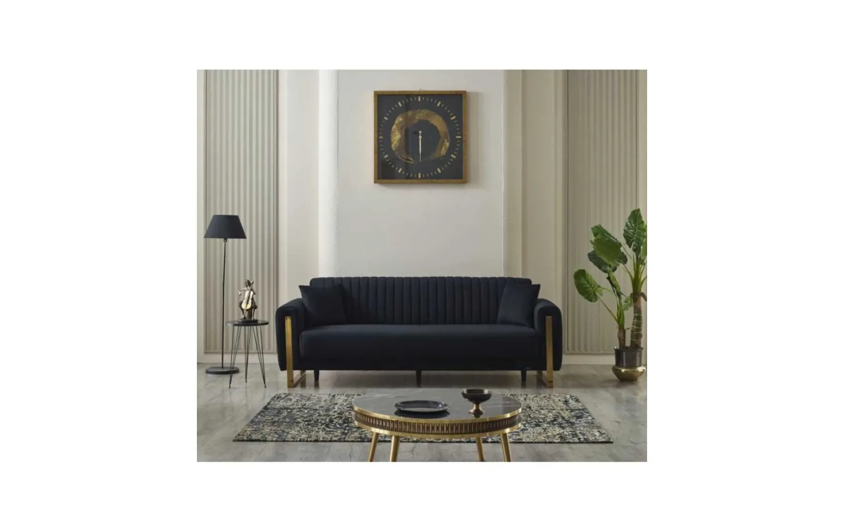 Dieses moderne 3-Sitzer Sofa verbindet elegantes Design mit hohem Sitz- und Liegekomfort. Der schwarze Stoffbezug harmoniert stilvoll mit den goldfarbenen Kufenfüßen und verleiht dem Sofa eine edle Ausstrahlung. Dank integrierter Liegefunktion und angenehmer Polsterung eignet sich das Sofa ideal zum Entspannen sowie als praktische Schlafgelegenheit.