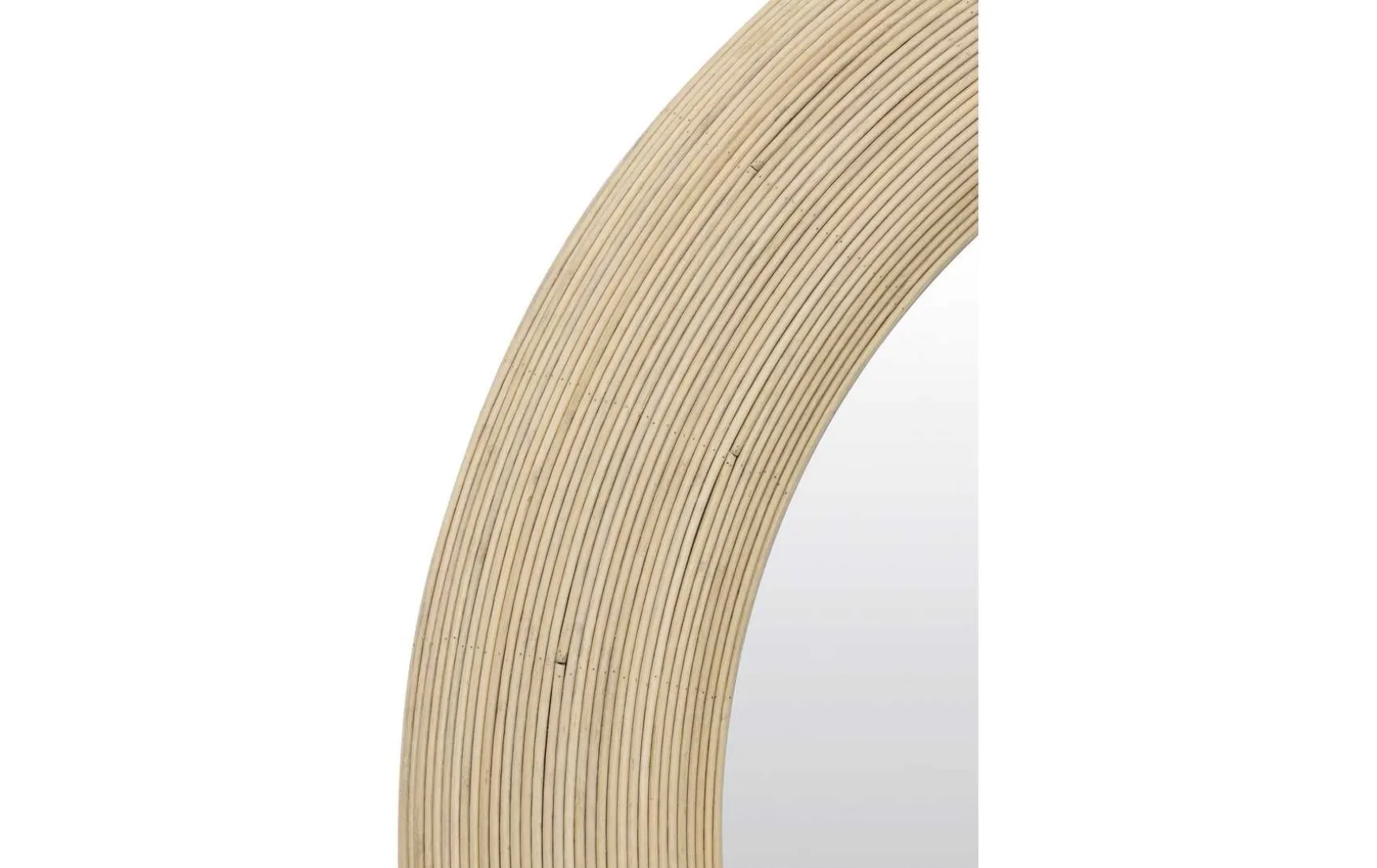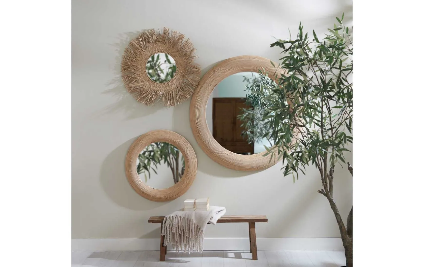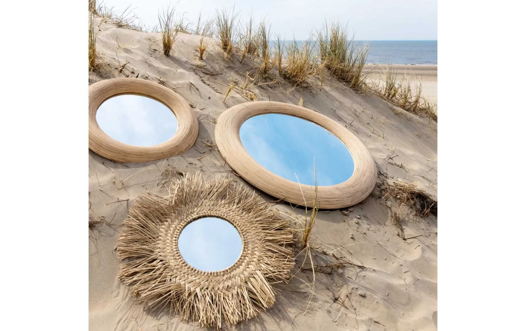 Dieser Wandspiegel mit Rattan natur-Rahmen bietet eine überzeugende Kombination aus Funktionalität und schlichtem Design für Ihren Eingangsbereich.