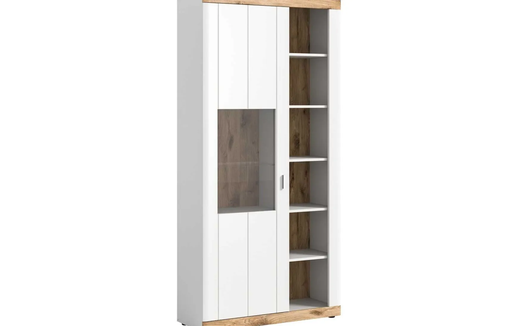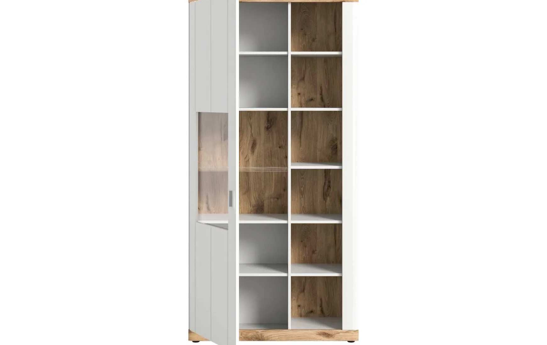 Die Stauraumvitrine im Landhausstil vereint großzügigen Stauraum mit einem eleganten, zeitlosen Design. Die weiß matte Oberfläche in Kombination mit der stilvollen Absetzung in Nox Eiche Dekor sorgt für eine warme und wohnliche Ausstrahlung. Mit einer Drehtür, sieben Fächern und insgesamt sieben Böden bietet die Vitrine vielseitige Aufbewahrungs- und Präsentationsmöglichkeiten für Geschirr, Deko oder Wohnaccessoires. Die Maße von ca. 100 × 204 × 37,5 cm nutzen die Höhe optimal aus und machen die Stauraumvitrine ideal für Wohn- und Essbereiche. Dank der pflegeleichten, glatten Oberflächen lässt sich das Möbel einfach feucht abwischen. Die Lieferung erfolgt vormontiert, eine LED-Beleuchtung ist nicht im Lieferumfang enthalten.
