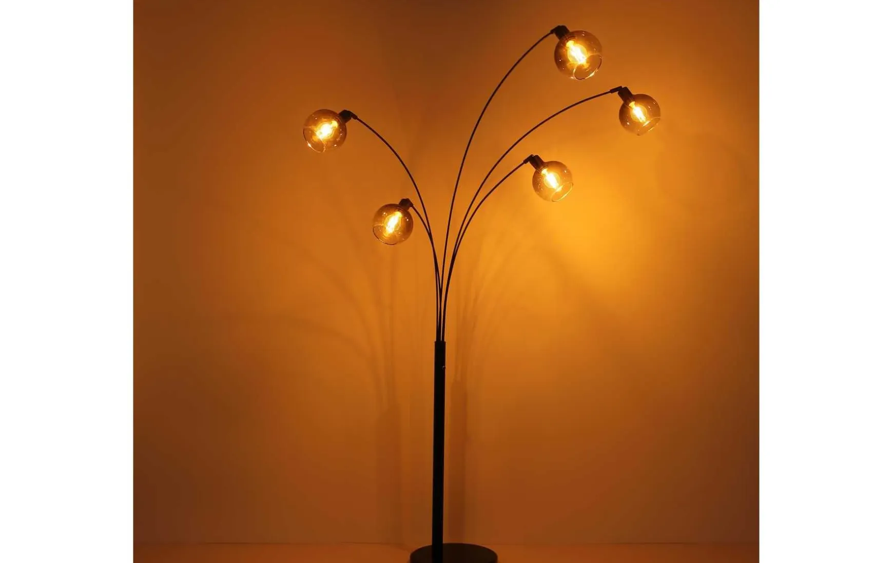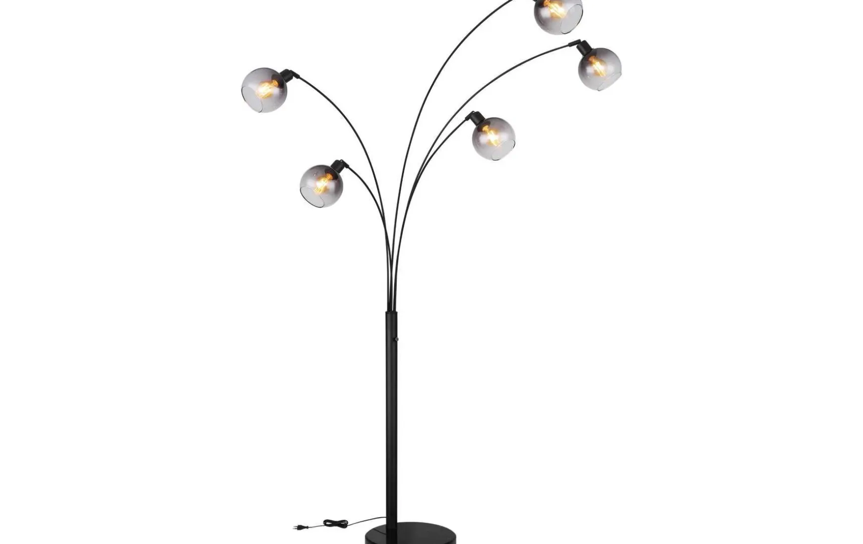 Elegant und modern, das verbindet diese wundervolle schwarz matte Stehlampe mit einem Marmorsockel und einer Höhe von 208 cm. Die fünf angebrachten E27 Fassungen werden von rauchfarbenen Glasschirmen umhüllt und durch die E27 Fassungen steht es Ihnen frei, selbst zu entscheiden, welches Leuchtmittel (max. 40W) Sie verwenden wollen und somit auch die Lichtstärke und Lichtfarbe.