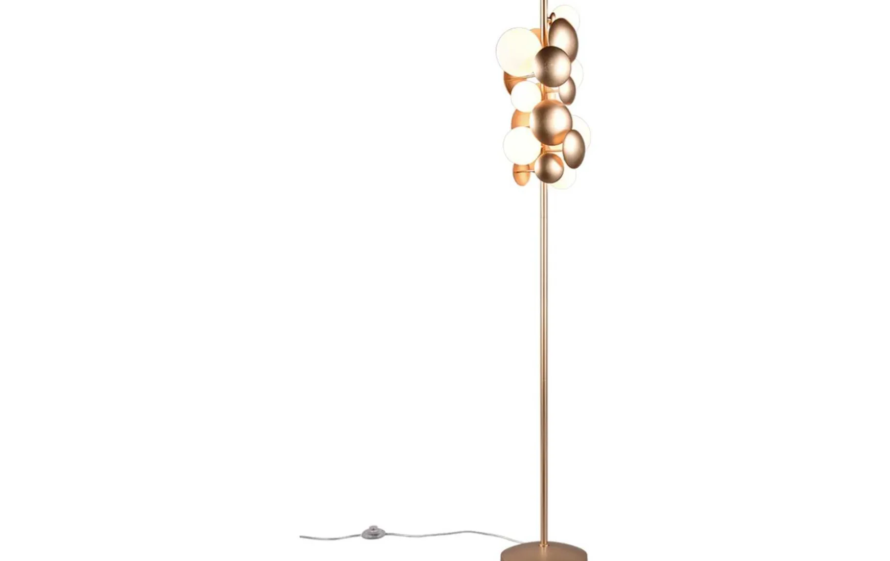 Diese Leuchte setzt bemerkenswerte Akzente mit Wow-Effekt. Die Stehleuchte entfaltet ihre außergewöhnliche Wirkung besonders eindrucksvoll im Wohnbereich und spielt, dank ihres unverwechselbaren Designs, mit Licht und Schatten. Über einen Fußschalter lässt sich die Leuchte bequem ein- und ausschalten. Die einzigartige Gestaltung der Leuchte wird durch die Materialkombination von weißem Glas und goldfarbenem Metall betont.