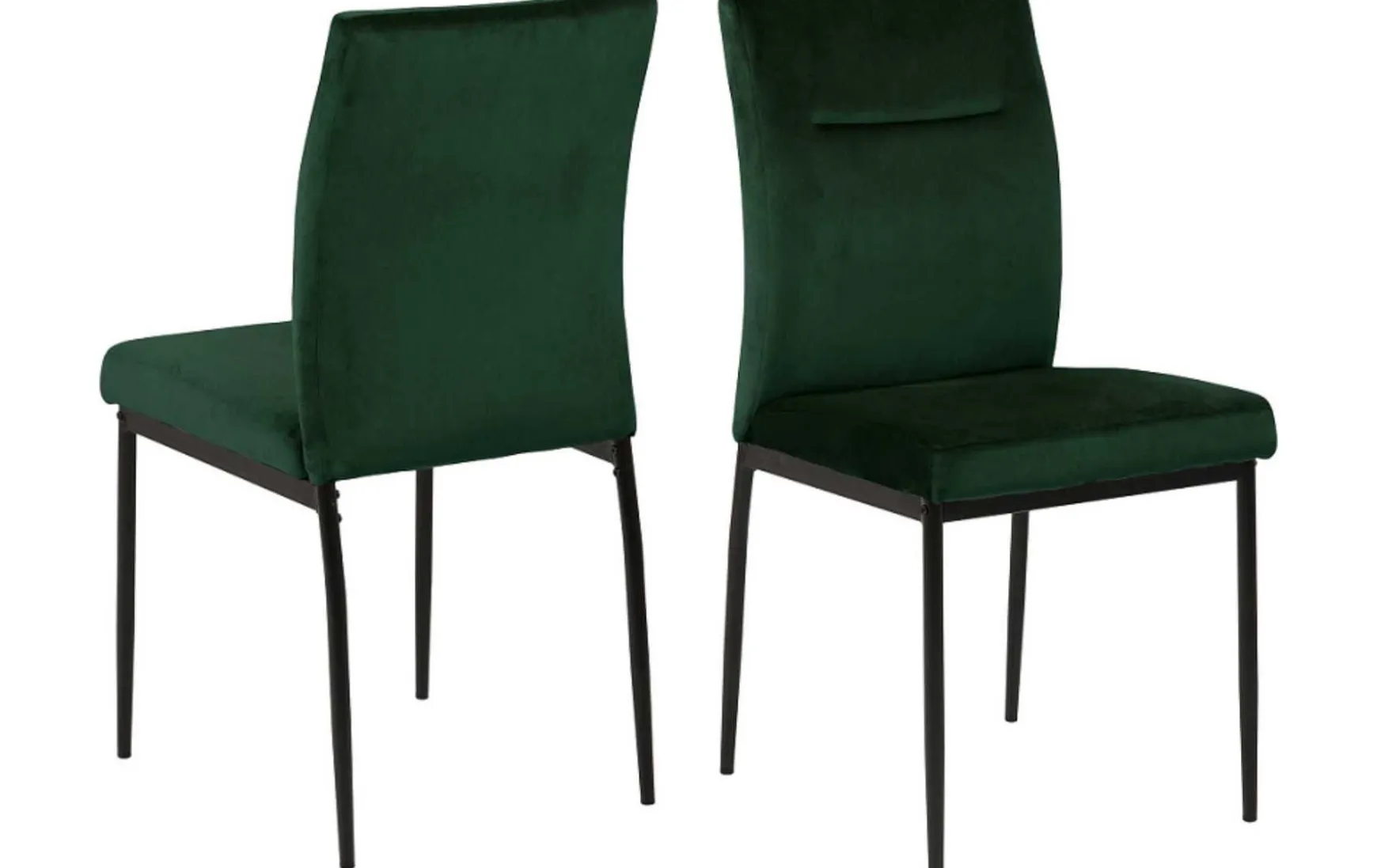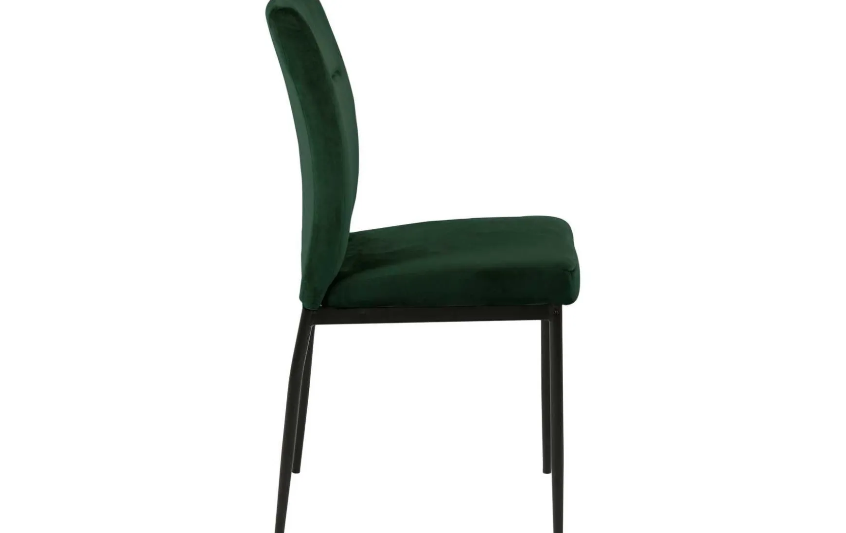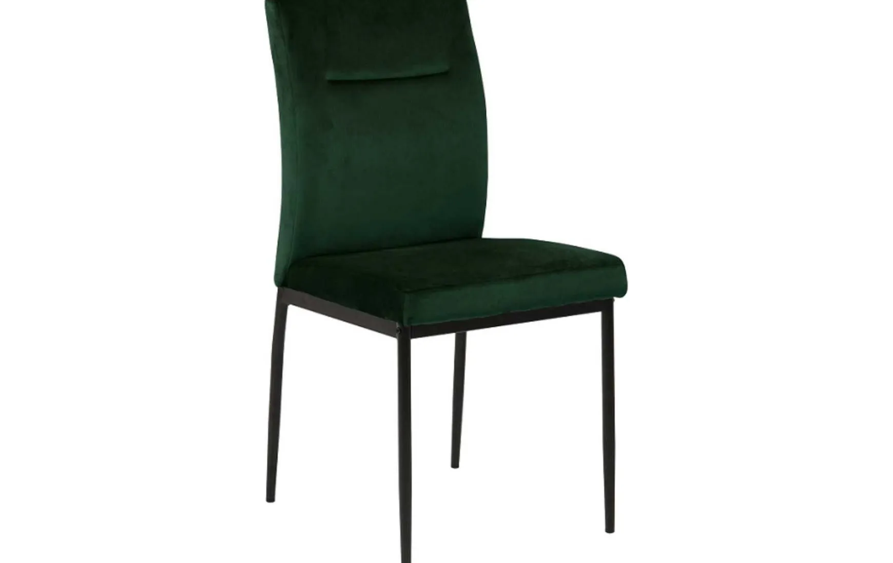 Dieser Esszimmerstuhl ist subtile Eleganz. Er zeichnen sich durch klare Linien ohne Schnörkel aus. Die profilierte Rückenlehne passt sich der Wölbung des Rückens an. Der dunkelgrüne Stoff passt gut zum schwarzen Metallfuß.