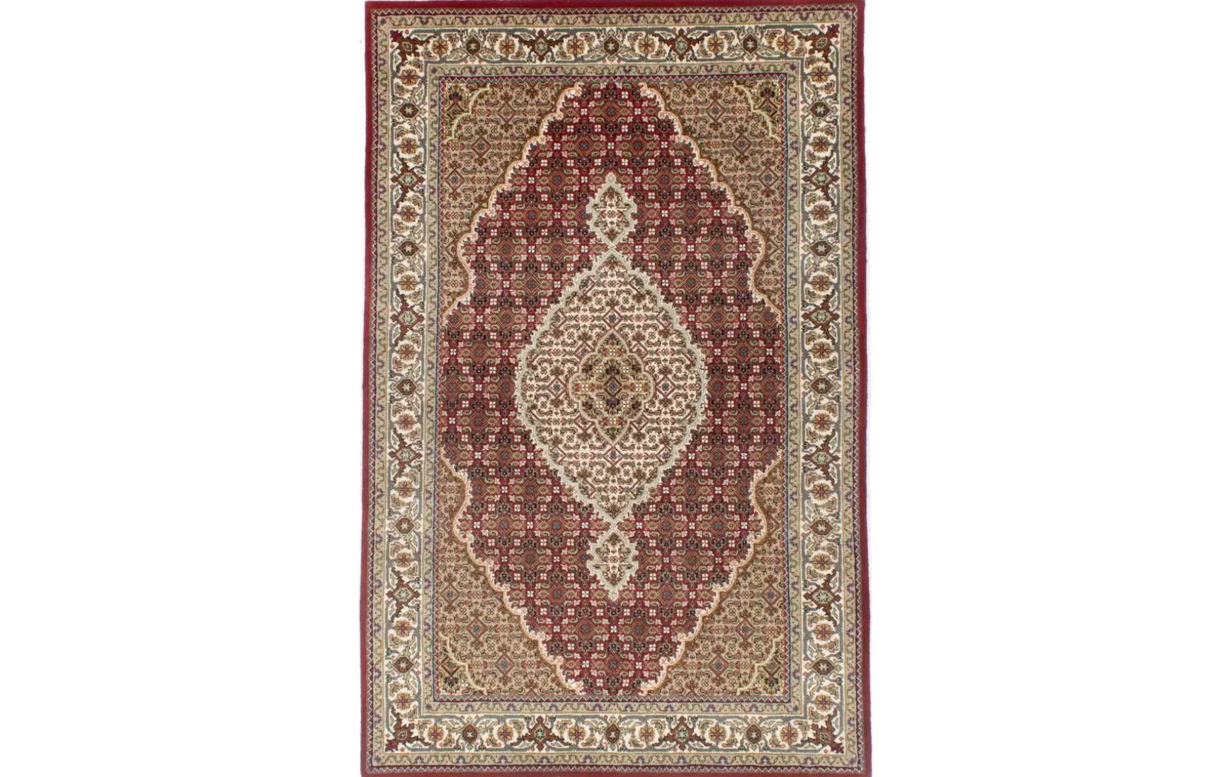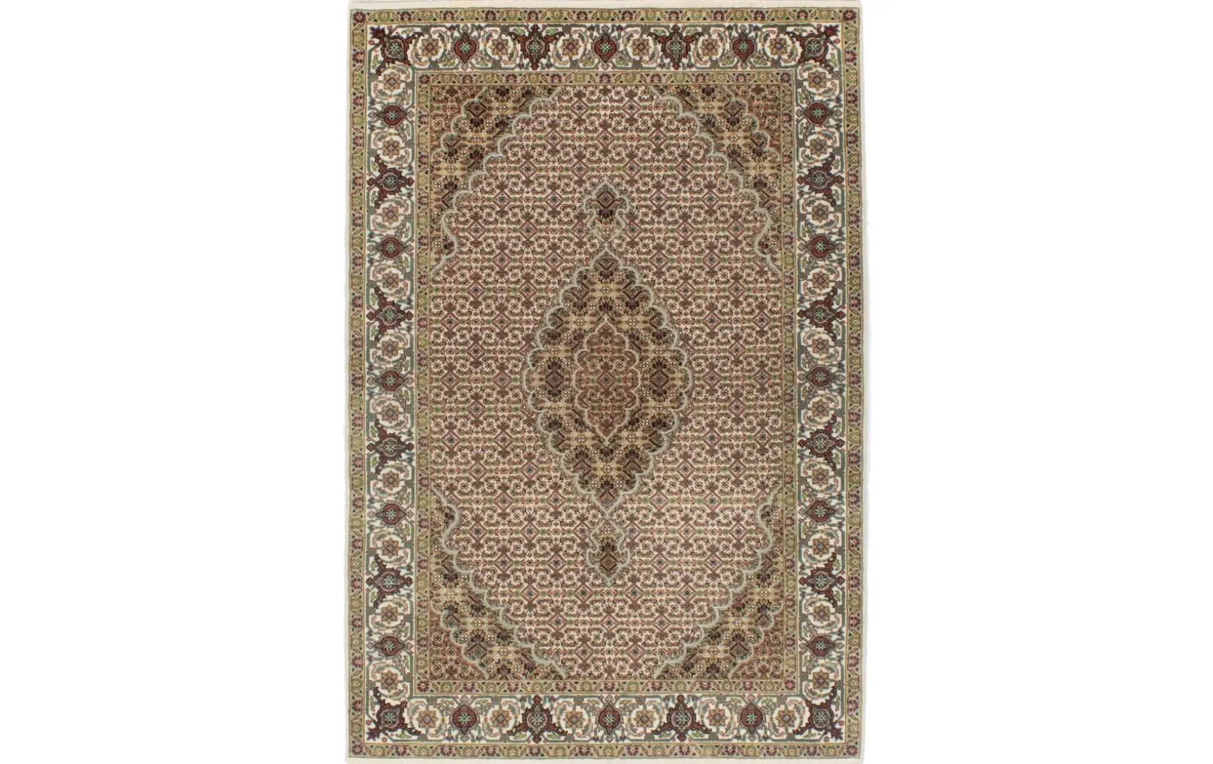 Erfreuen Sie sich an der zeitlosen Schönheit eines handgeknüpften Mahi Teppichs aus Indien, gefertigt aus luxuriöser Neuseelandwolle. Jeder Knoten wurde von erfahrenen Handwerkern sorgfältig gesetzt, um ein Meisterwerk voin unvergleichlicher Qualität zu schaffen. Die reiche Textur und die präzisen Muster erzählen eine Geschichte, die Jahrhunderte alt ist. Dieser Teppich wird Ihr Zuhause mit seinem exquisiten Design und seiner unvergleichlichen Weichheit bereichern. Willkommen in der Welt zeitloser Eleganz und erstklassiger Handwerkskunst.