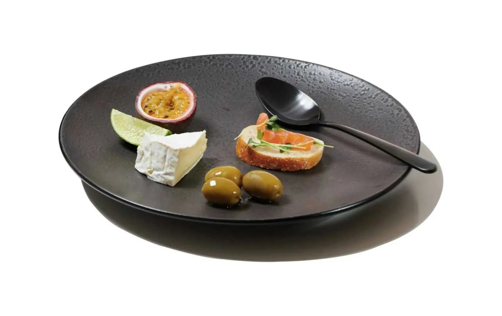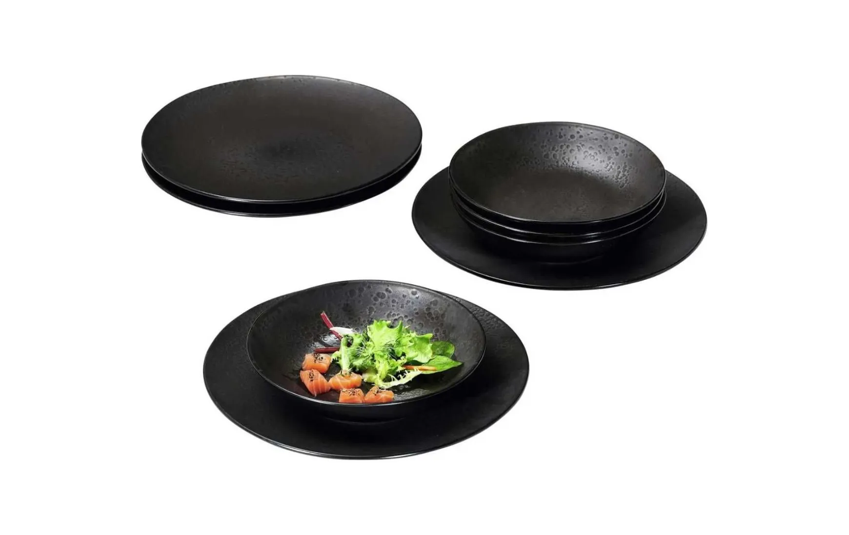 Smart und stylish: Bei diesem Tafelservice fasziniert die Kombination aus Flächen mit gemasertem und solchen mit glattem Finish. Die Maserung, die sich während des Brennvorgangs auf Basis einer sogenannten Reaktivglasur individuell entwickelt, macht jedes Geschirrteil zu einem Unikat. Dank der Coupeform und dem seidenmatten Schwarzton punktet das Produkt ganz nebenbei als zeitgemäßes Gourmet-Geschirr.
