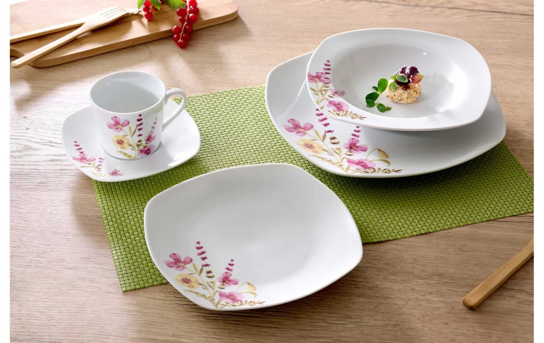 Die weißgrundigen Keramikteile sind mit einem farbenfrohen Blumenmotiv verziert, das eine zeitlose Ästhetik auf Ihr Esszimmer überträgt.