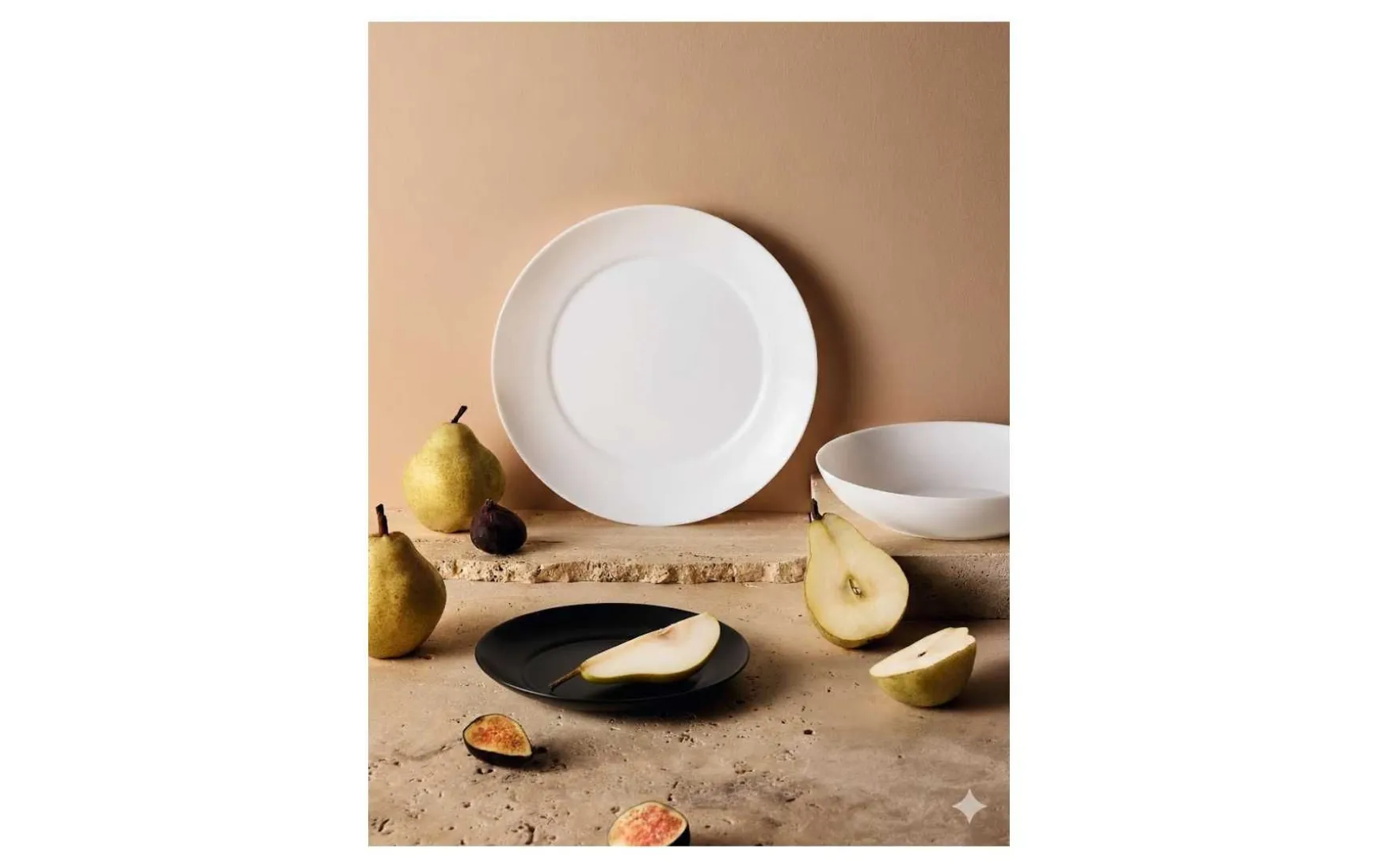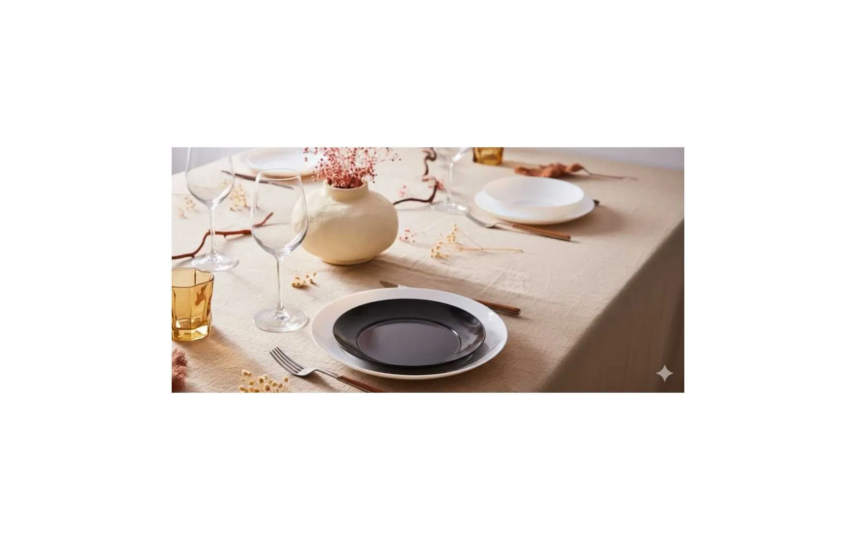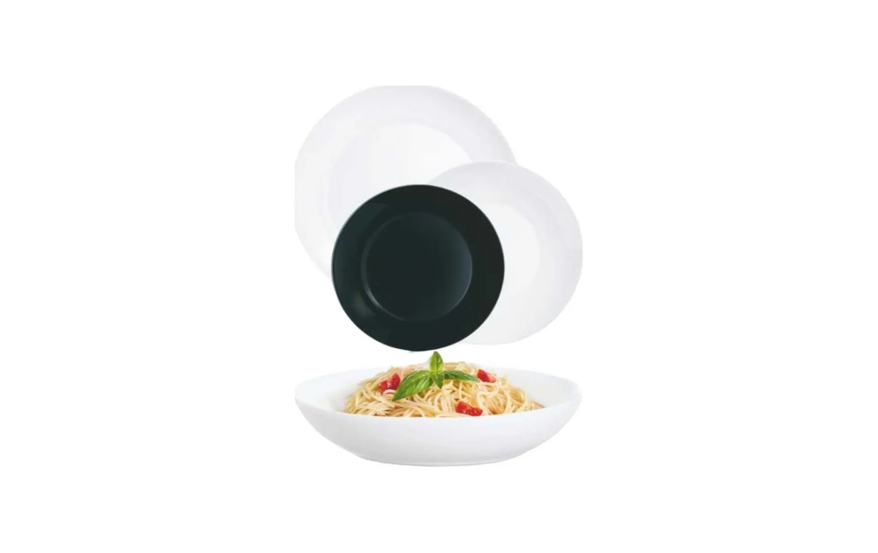Das Set besteht aus 6 weißen Speisetellern 25cm, 6 weißen Suppentellern 20cm und 6 schwarzen Desserttellern 18cm.