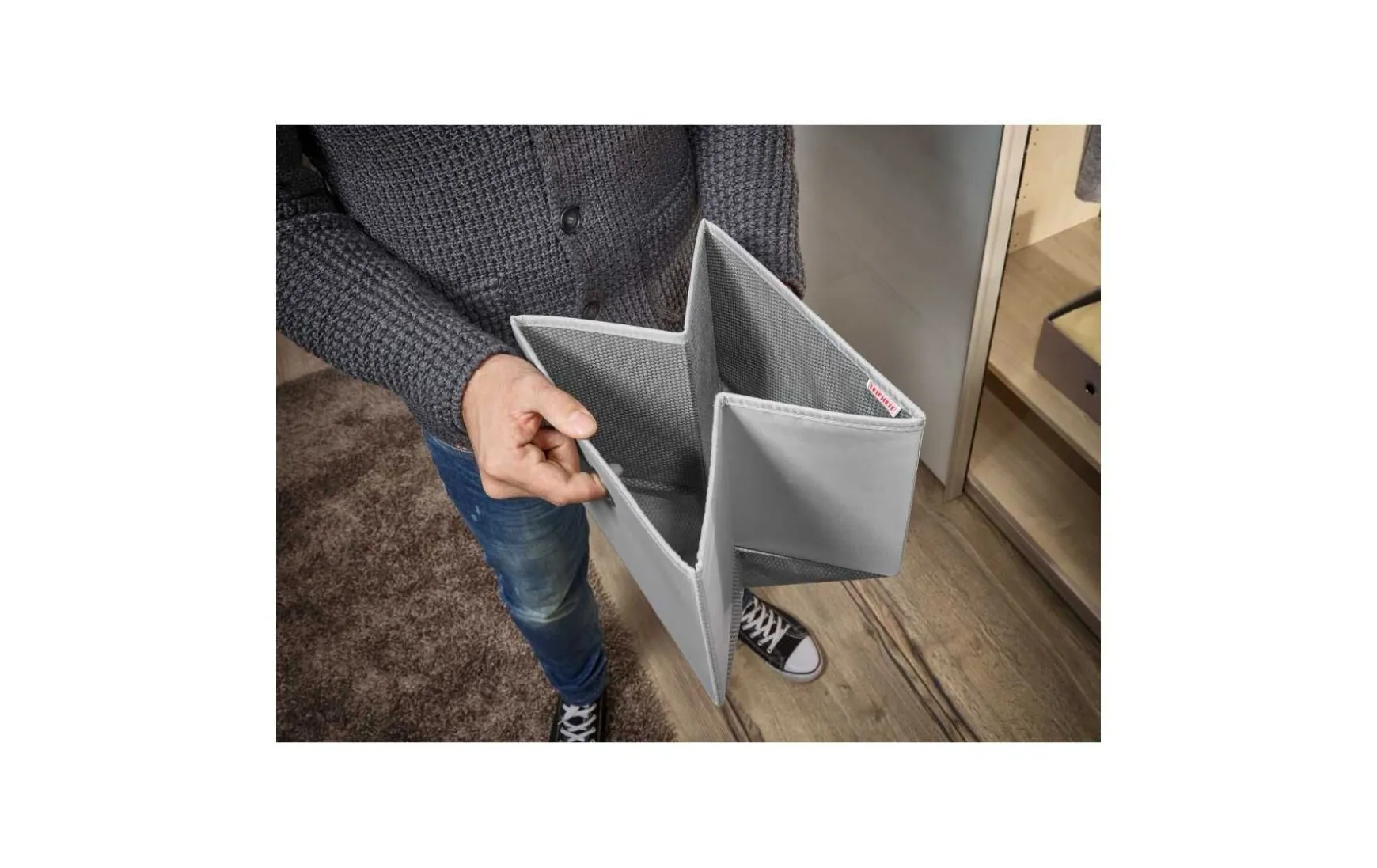 Ideal für Unterwäsche, Socken, Gürtel, Halstücher, Accessoires und sämtliche kleineren Gegenstände, die sauber und übersichtlich sortiert aufbewahrt werden sollen. Diese Boxen in ansprechendem grauem Design aus Stoff bringen in Handumdrehen Ordnung in den Schrank. Besonders praktisch sind die zusätzliche Verstärkung in den Wänden sowie der verstärkte Boden. So lassen sie sich auch gefüllt gut aus den Regalen ziehen. Eine schicke Metallöse auf der Vorderseite macht die Handhabung zusätzlich einfacher. Auch die Höhe von nur 13 cm ist ideal, um jederzeit einen guten Überblick über den gesamten Boxeninhalt zu haben. Damit der Inhalt sauber und hygienisch lagert, bestehen die Boxen aus einem mehrlagigen, engmaschig gewebten Stoff, der atmungsaktiv und abwaschbar ist. Sie lassen sich mit einigen Handgriffen zusammenfalten und platzsparend verstauen.