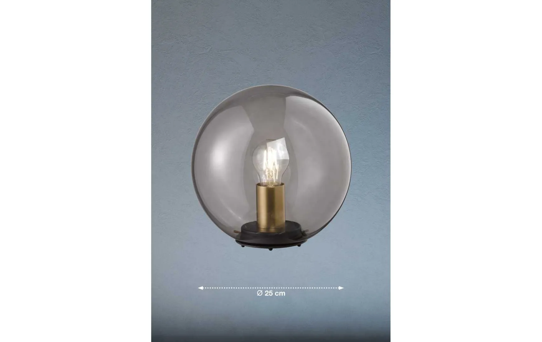 Die Kugelleuchte hat einen Durchmesser von 25 cm und ist aus rauchfarbenem Glas gefertigt.