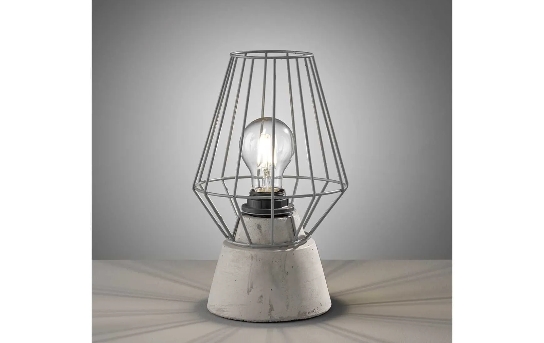 Bei dieser Tischleuchte steht der silberfarbige Lampenschirm im schönen Kontrast zum sandgrauem Fuß und erzeugt spannende Licht- und Schatteneffekte.