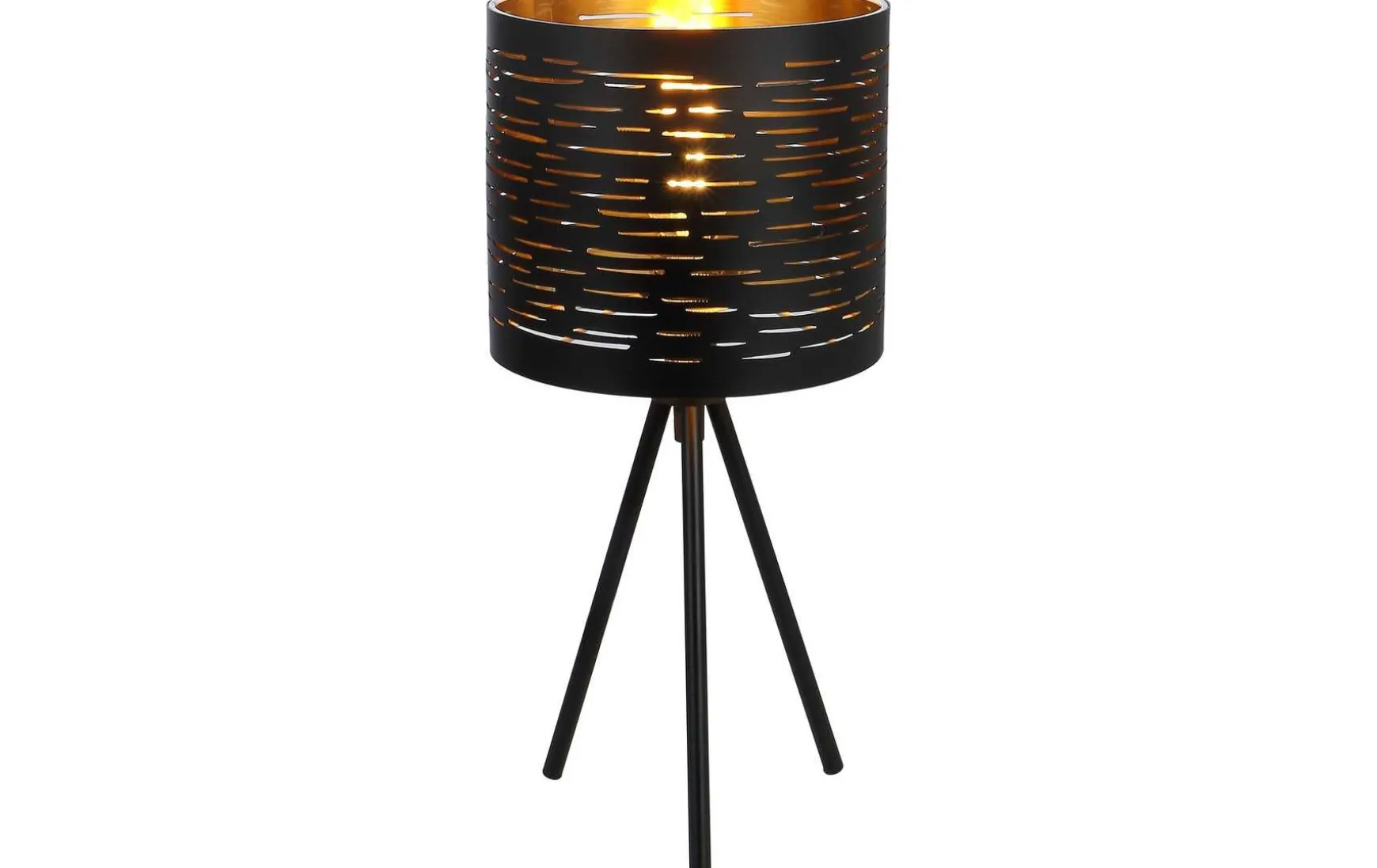Die 35 cm hohe, dreibeinige Tischleuchte besteht hauptsächlich aus einem mit formschönen Dekorstanzungen dekoriertem schwarzem Textil, das von der Innenseite mit Blattgold belegt ist.