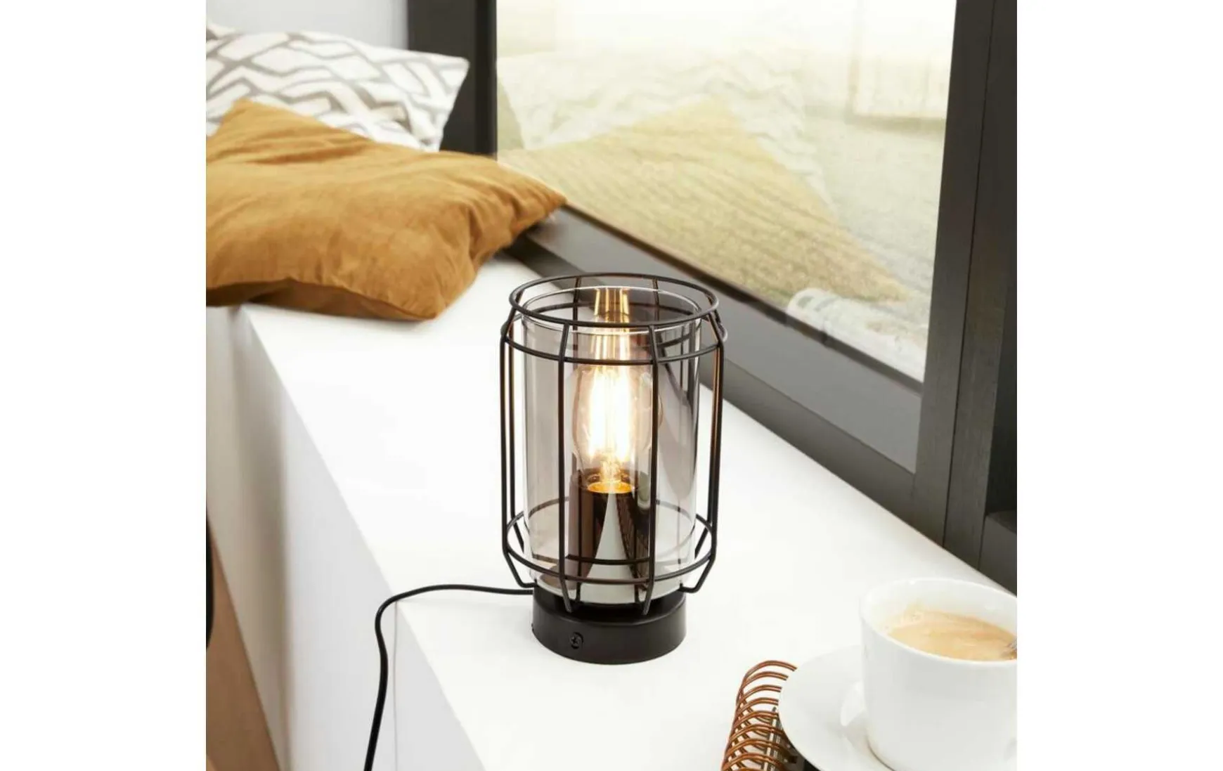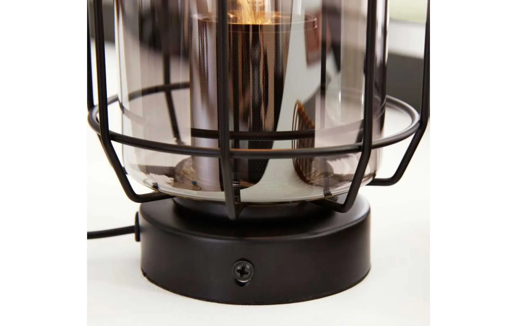 Diese Tischleuchte verbindet qualitativ hochwertige Materialien mit einem herausragenden Design. Sie besteht aus robustem Metall in puristischem Schwarz matt, kombiniert mit stabilem, rauchfarbenen Glas. Der Durchmesser der Tischlampe beläuft sich auf ca. 13 cm; ihre Höhe beträgt ca. 20 cm. Optisch weist die Leuchte moderne Merkmale, aber auch Anklänge des angesagten Industriestils auf. Durch diese besondere Mischung setzt sie einen gelungenen Akzent auf jedem Schreib- oder Beistelltisch sowie auch auf verschiedenen Kommoden im Wohn- oder Schlafzimmer. Zur Nutzung der stilvollen Tischleuchte wird ein Leuchtmittel der Fassung E27 benötigt. Dieses ist nicht im Preis inbegriffen.