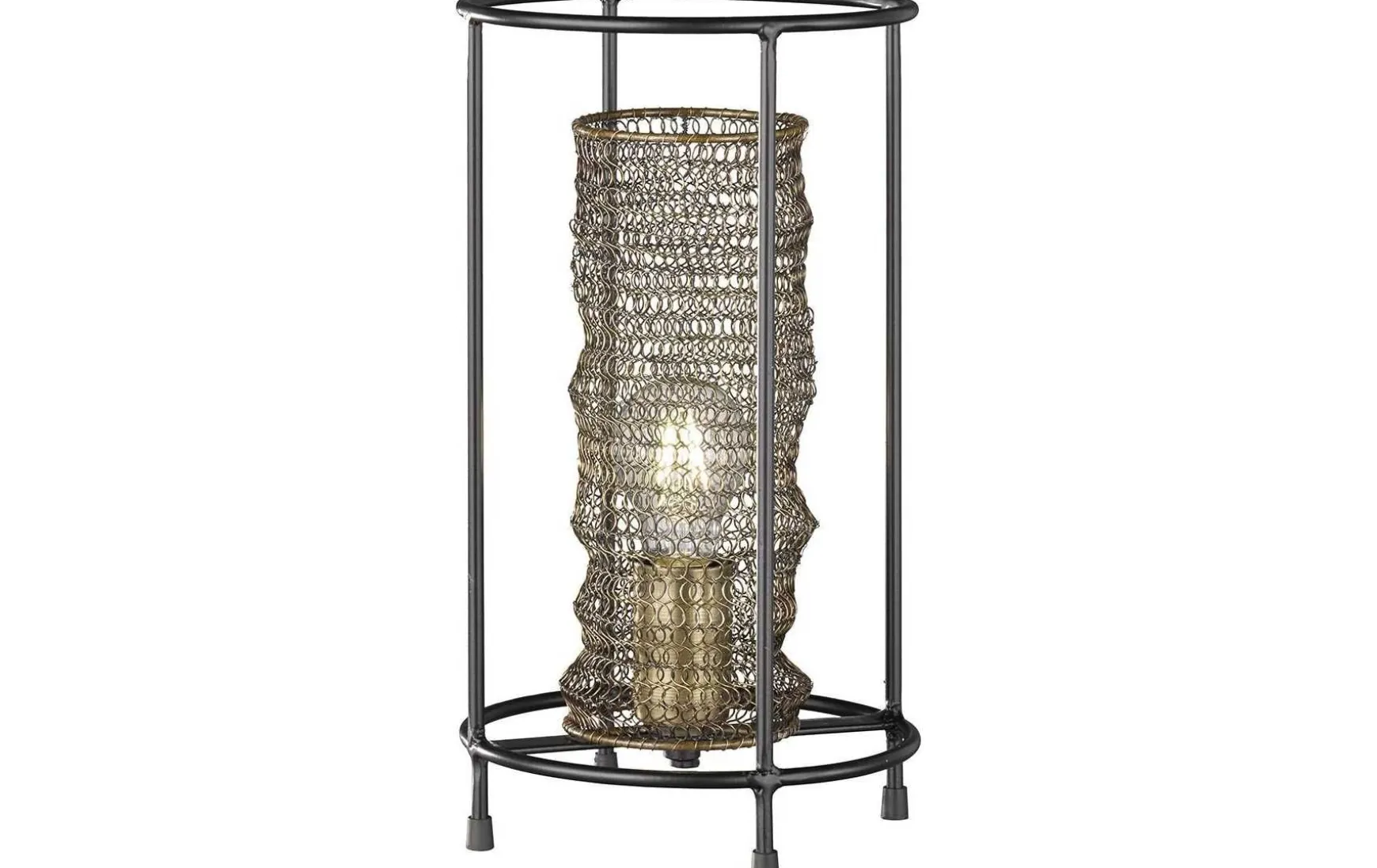 Hergestellt aus Metall befindet sich in dem runden Rahmen die E27 Fassung unter einem messingfarbenem Lampenschirm aus Kettengliedern.