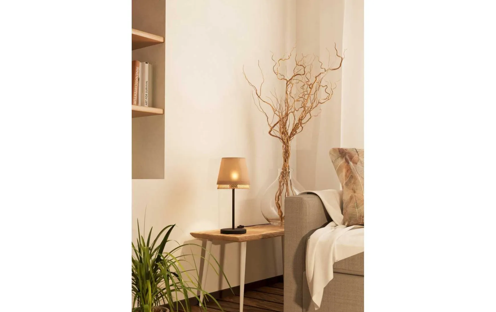 Diese Tischleuchte ist mit zwei ineinandergesetzten runden Lampenschirmen und einem schwarzem Metall-Leuchtenfuß gefertigt. Die harmonische Kombination aus dem äußeren Leinenschirm in naturfarben und dem inneren Schirm aus einem Bambus-Gitter verleiht der Leuchte einen wohnlichen Look. Im eingeschalteten Zustand wird die natürliche Struktur des Stoffes sichtbar. Ebenso ist ein bequemes Ein- und Ausschalten über einen Schalter am Kabel möglich. Die Tischlampe fügt sich in moderne Einrichtungsstile wie den Nature-Trend ein und bietet eine wohnliche Beleuchtung im Schlafzimmer, im Wohnzimmer, Esszimmer oder im Vorzimmer. Geeignet ist die Leuchte für jedes Leuchtmittel mit E27-Sockel.