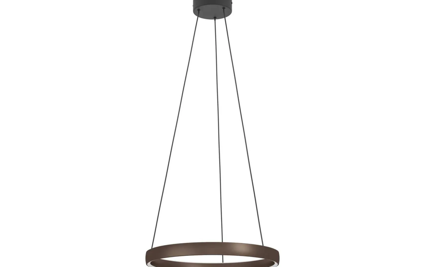 Der ringförmige Leuchtkörper besteht aus Aluminium und Stahl in einem eleganten Bronze-Finish, gehalten von filigranen Seilabhängungen und einem runden Baldachin in Schwarz.