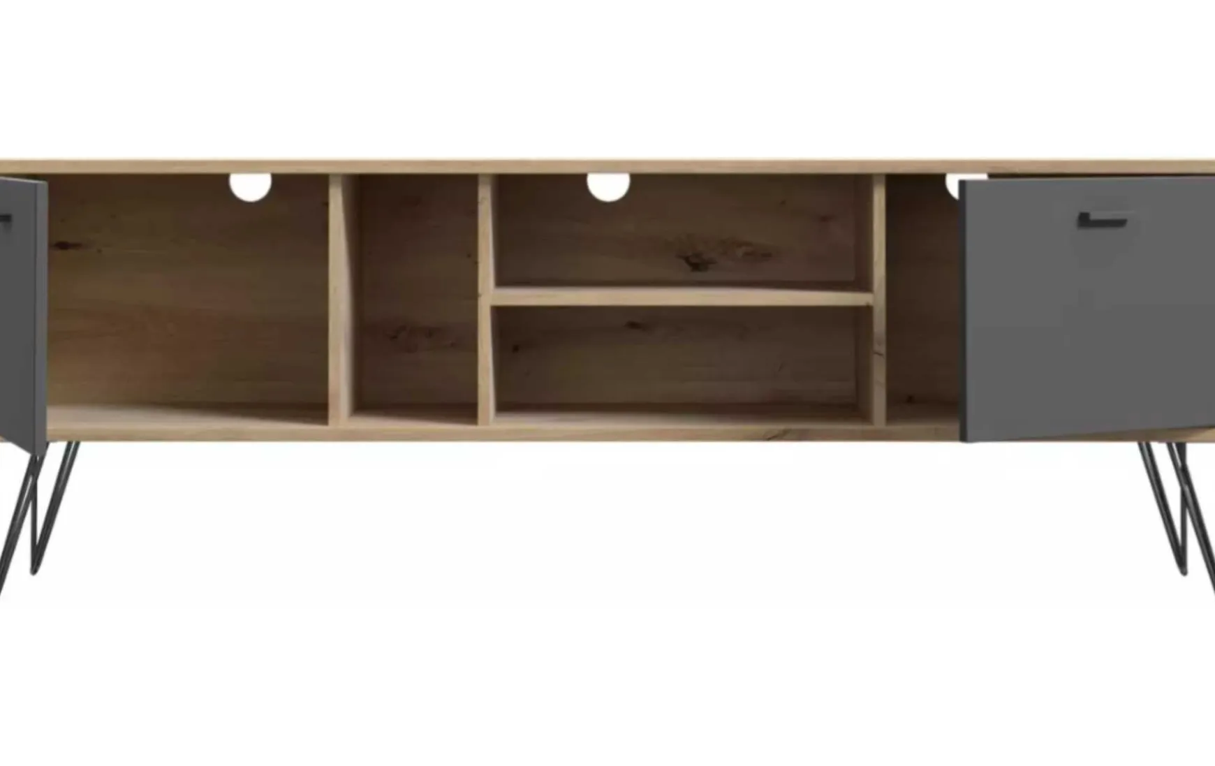 Dieses TV Lowboard im modernen Design in Artisan Eiche Dekor und Schwarz verbindet stilvolle Optik mit praktischer Funktionalität. Die Kombination aus warmer Holzoptik und schwarzer Front sorgt für einen zeitgemäßen Look und passt perfekt zu modernen Wohn- und Medienbereichen. Das stabile Metallgestell in Schwarz sowie die passenden Metallgriffe unterstreichen den modernen Charakter des Möbelstücks. Mit seinen Maßen von ca. 163 × 41,5 × 58 cm (B/T/H) bietet das Lowboard ausreichend Platz für Fernseher und Multimedia-Geräte. Hinter den zwei Drehtüren sowie in den drei offenen Fächern lassen sich Receiver, Konsolen, Zubehör oder Dekorationen ordentlich unterbringen. Gefertigt aus robustem Holzwerkstoff mit Dekoroberfläche, ist das Möbelstück langlebig und pflegeleicht – die Oberfläche kann einfach trocken abgewischt werden. Das TV Lowboard wird zerlegt geliefert und lässt sich einfach montieren.