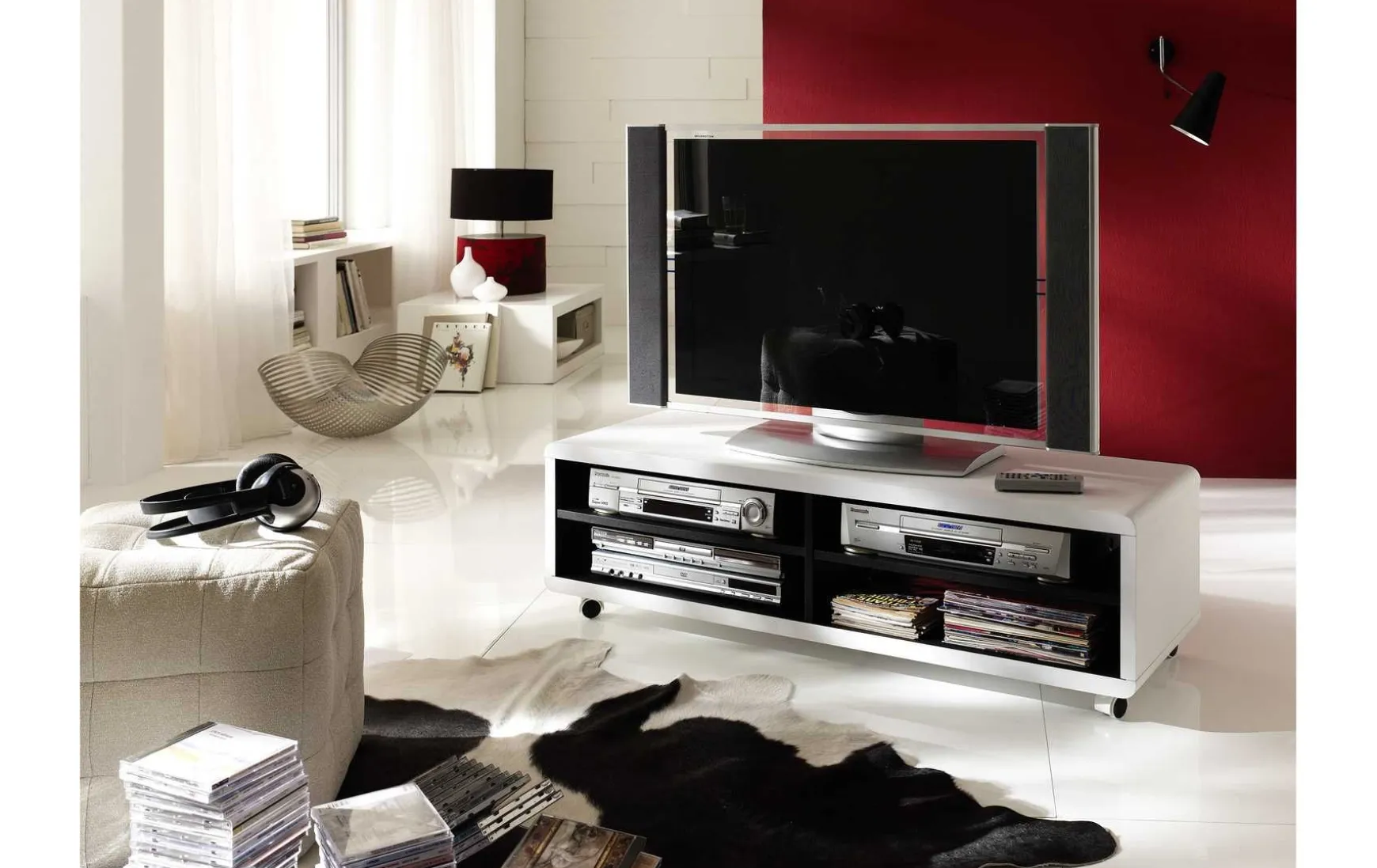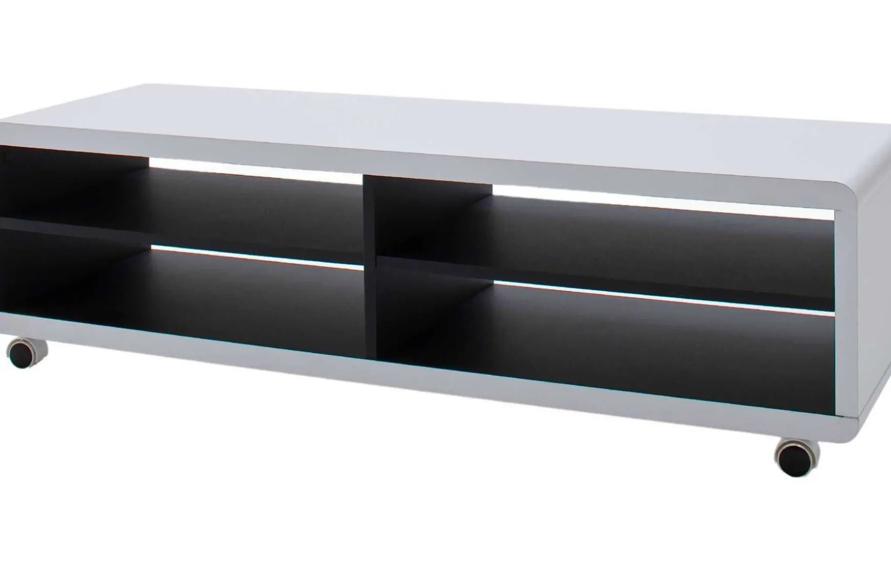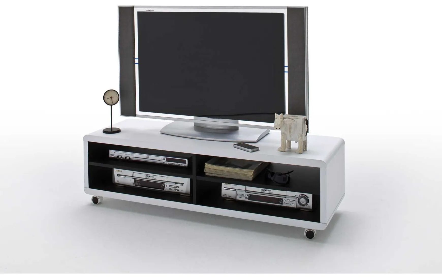 Das TV-Lowboard in weiß ist der mobile Standort für gemütliche Abende im Pantoffelkino. Dank stilvollem und doch puristischem Design mit abgerundeten Ecken kann der Fernsehtisch auf Rollen vielseitig einsetzt und mit verschiedenen Möbelstücken kombiniert werden. Wegen seines geringen Platzbedarfs von nur 120 x 35 cm (BH) passt der Fernsehschrank auch in kleine Wohnzimmer. Gefertigt aus einer Holz-Wabenplatte und Ablageboden aus MDF ist der TV-Schrank sehr robust. Die Oberflächen sind Sonoma Eiche sägerau foliert und damit auch pflegeleicht. Neben dem stilvollen Design bietet der praktische Fernsehschrank einen höhenverstellbaren Ablageboden, sodass zwei breite, offene Gerätefächer zur Verfügung stehen. Der Ablageboden darf mit bis zu 5 kg belastet werden und ist somit stabil genug für Ihre Unterhaltungselektronik. Die Oberseite dürfen Sie hingegen mit einem bis zu 30 kg schweren Fernsehgerät belasten. Mit vier robusten Rollen ausgestattet, ist das TV-Lowboard leicht beweglich und kann bei Bedarf einfach an einen anderen Standort geschoben werde