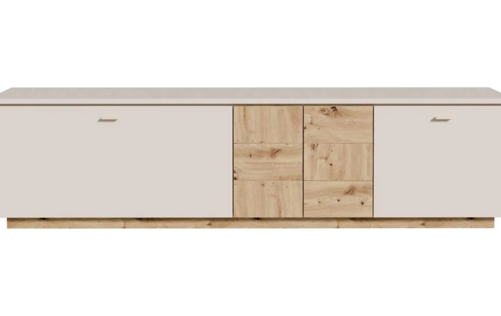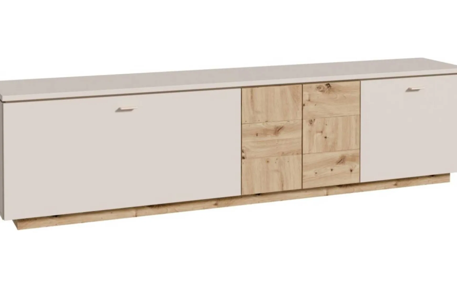 Das Lowboard in Sandfarbe mit Absetzungen in Artisan Eiche Dekor vereint modernes Design mit innovativer Funktionalität und wird zum stilvollen Mittelpunkt deines Wohnbereichs. Mit seinen großzügigen Maßen von 224,8 × 57,7 × 41,6 cm (B × H × T) bietet es viel Stauraum für Mediengeräte, Zubehör und Wohnaccessoires. Der elegante sandfarbige Korpus wird durch warme Artisan-Eiche-Akzente harmonisch ergänzt und sorgt für eine zeitlose, wohnliche Ausstrahlung. Dank Soft-Close-Technologie schließen Türen und Klappen sanft und leise, während die Push-to-Open-Funktion ein griffloses, minimalistisches Erscheinungsbild ermöglicht. Die schwebende Optik verleiht dem Lowboard zusätzliche Leichtigkeit und unterstreicht den modernen Charakter. Ob als TV-Lowboard oder stilvolle Stauraumlösung – dieses Möbelstück kombiniert Design, Komfort und Funktion auf hohem Niveau.