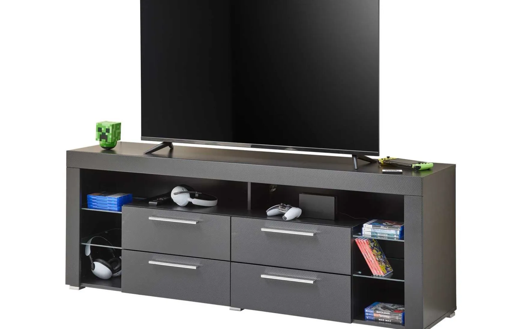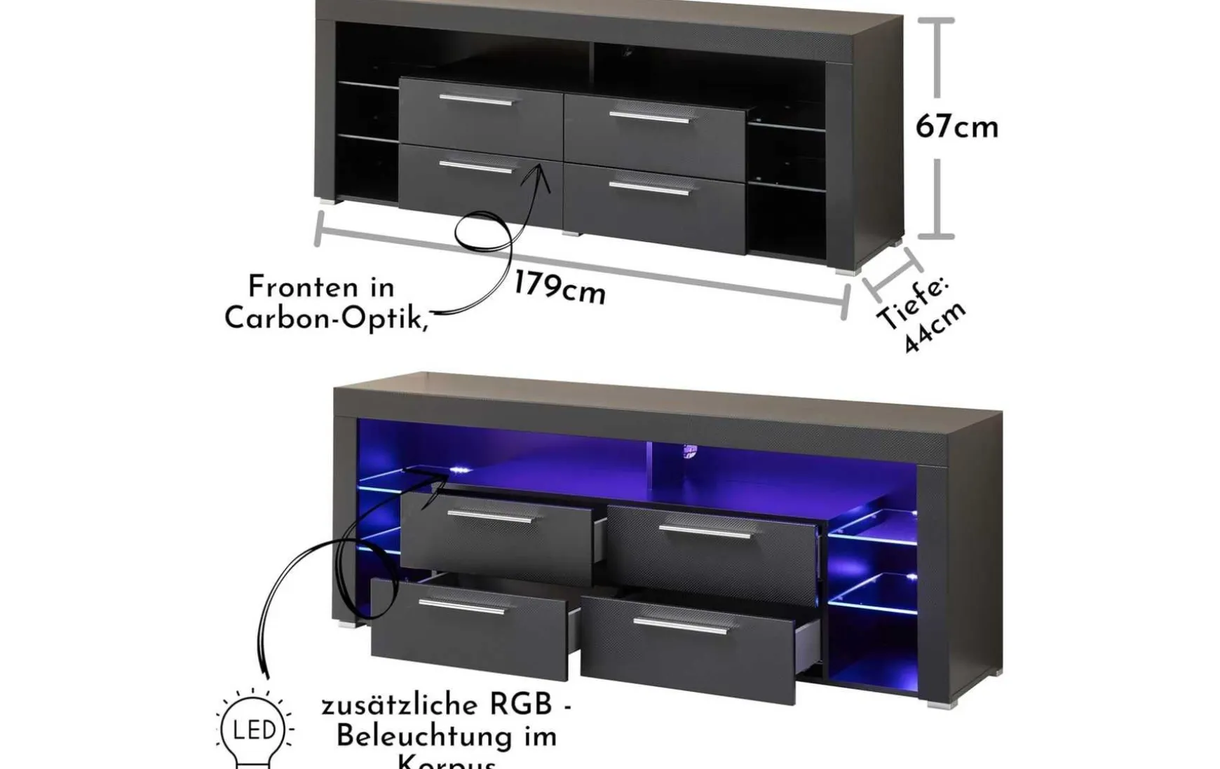 Das TV-Lowboard überzeugt mit seiner Front in Carbon-Optik, die einen modernen Akzent setzt. Der schwarze Korpus ergänzt das Design harmonisch, während silberne Griffe das Gesamtbild abrunden. VIEL STAURAUM – Die zahlreichen, offenen Fächer und die geräumigen Schubladen bieten genügend Stauraum für Multimedia Geräte und Zubehör. Der Oberboden bietet ausreichend Platz für einen Fernseher. RGB-BELEUCHTUNG – Die integrierte RGB-Beleuchtung im Korpus und an den Kanten schafft eine anpassbare Lichtatmosphäre, die sowohl das Lowboard als auch den gesamten Raum eindrucksvoll in Szene setzt. LEICHTE MONTAGE – Der TV-Schrank ist dank der detaillierten Anleitung schnell & leicht montiert und somit für Anfänger geeignet. Das Montage-Material ist inklusive. Maße: 179 x 67 x 44 cm (B/H/T).