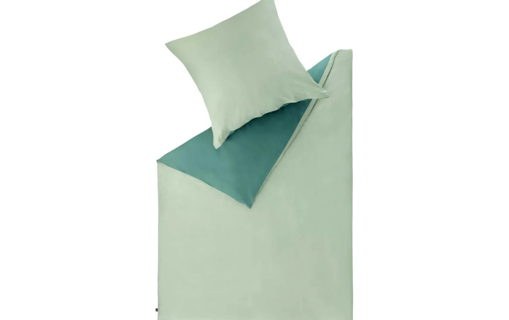 Die Kombination aus salbeifarbenem Baumwollsatin mit grüner Rückseite sorgt für dezente Kontraste und eine elegante Optik, die zu modernen wie klassischen Einrichtungen passt.