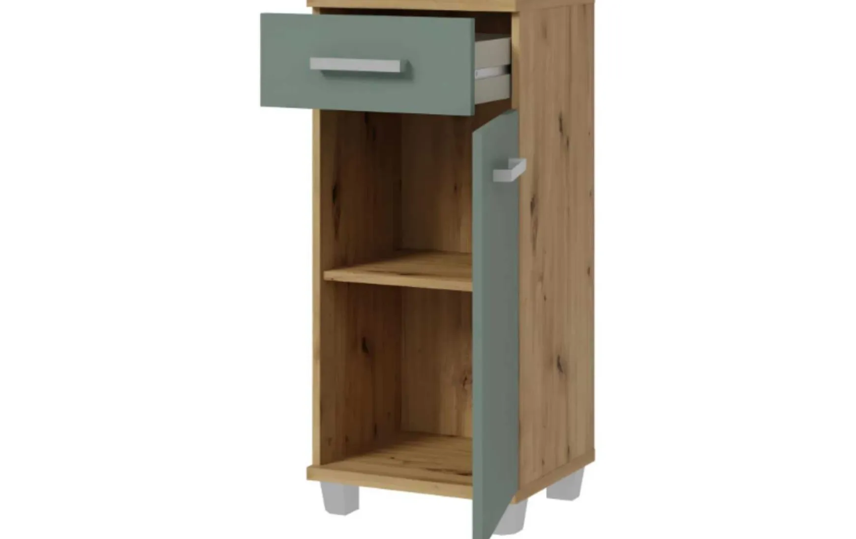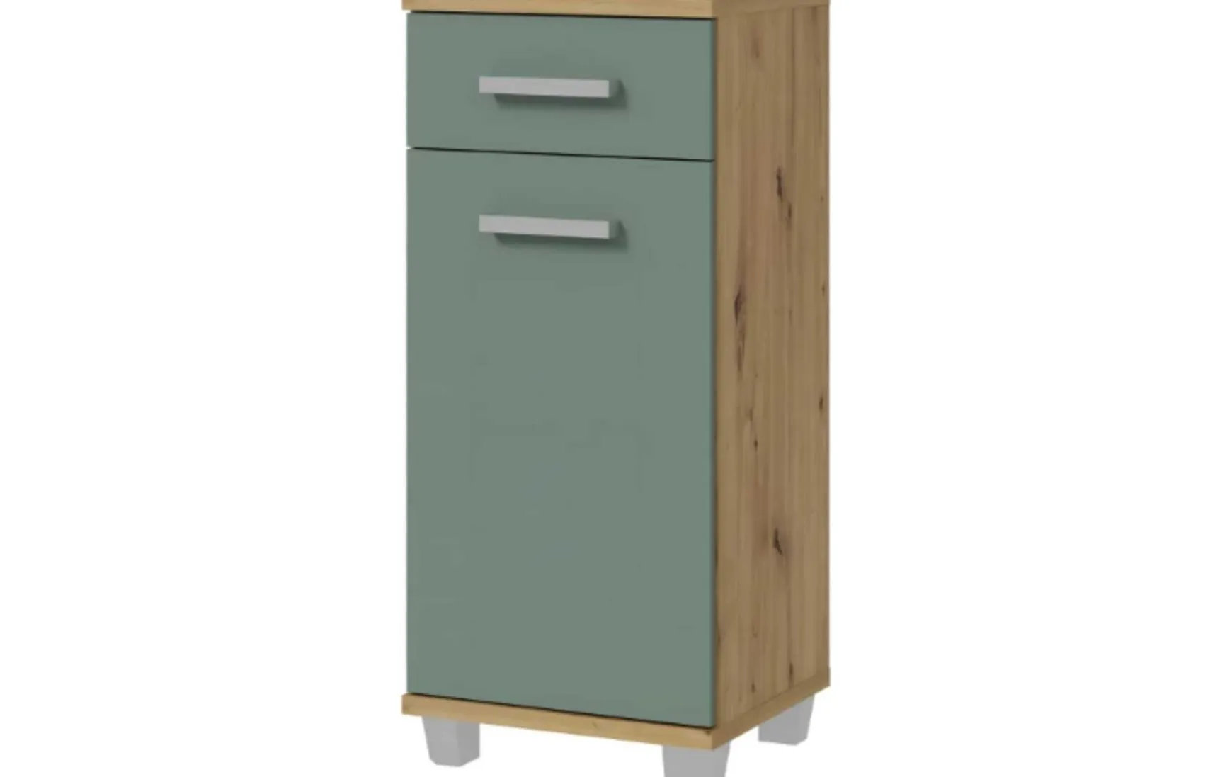 Dieser Unterschrank ist die perfekte Lösung, um Stil und Funktionalität in Ihrem Badezimmer zu vereinen. Mit einer eleganten Front in Sage und einem Korpus in Artisan Oak Nachbildung strahlt dieser Unterschrank zeitlose Eleganz aus. Er verfügt über eine Tür, einen Schubkasten und einen Einlegeboden, um Ihre Badutensilien ordentlich zu verstauen.