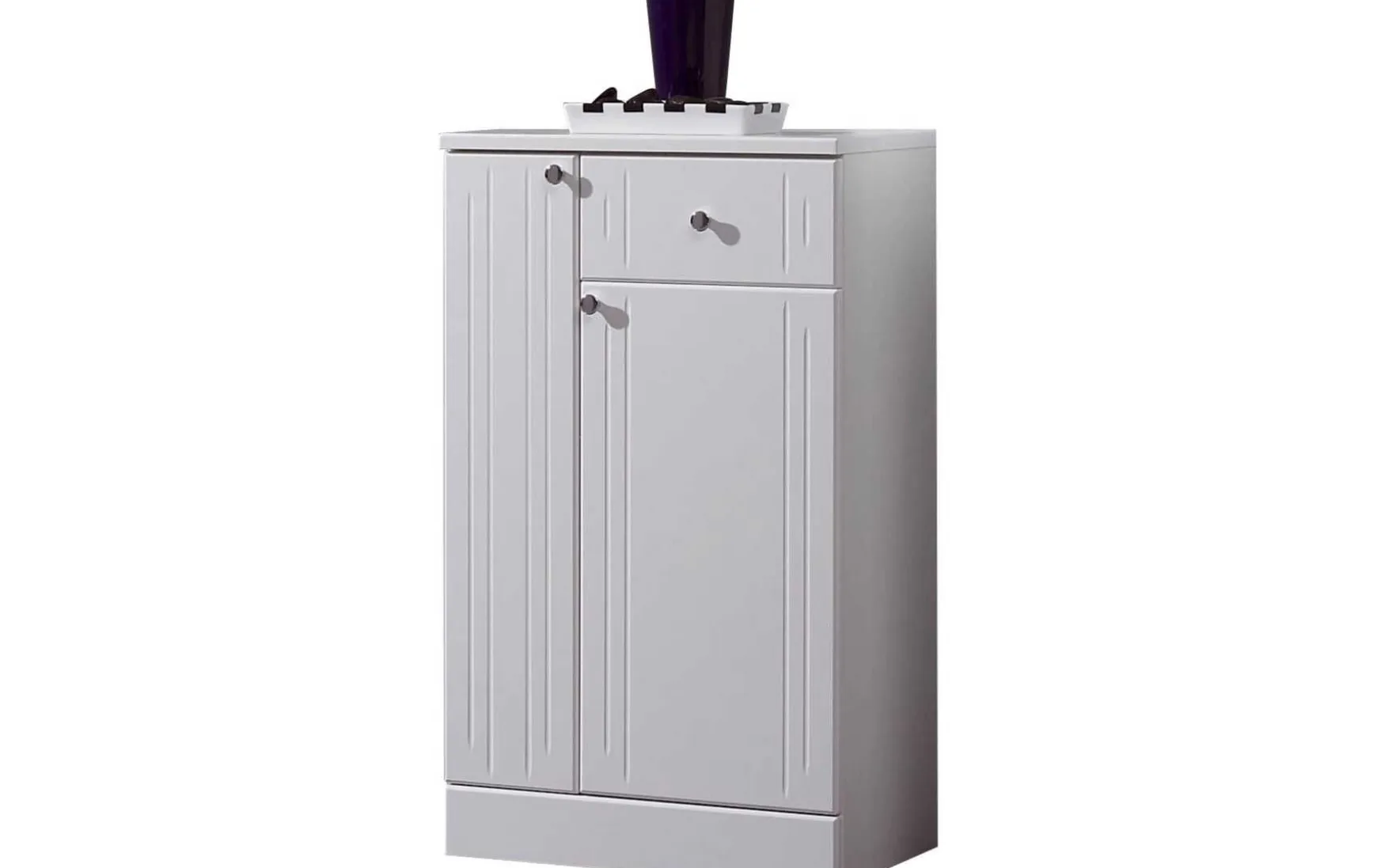 Der klassische Unterschrank in Weiß Hochglanz überzeugt durch seinen zeitlosen Look mit feinen Linien und bietet praktischen Stauraum für Bad oder Wohnbereich. Ausgestattet mit zwei Türen und einer Schublade ermöglicht der stehende Unterschrank eine übersichtliche Aufbewahrung von Alltagsgegenständen. Die chromglänzenden Griffknöpfe setzen elegante Akzente und unterstreichen den klassischen Stil.