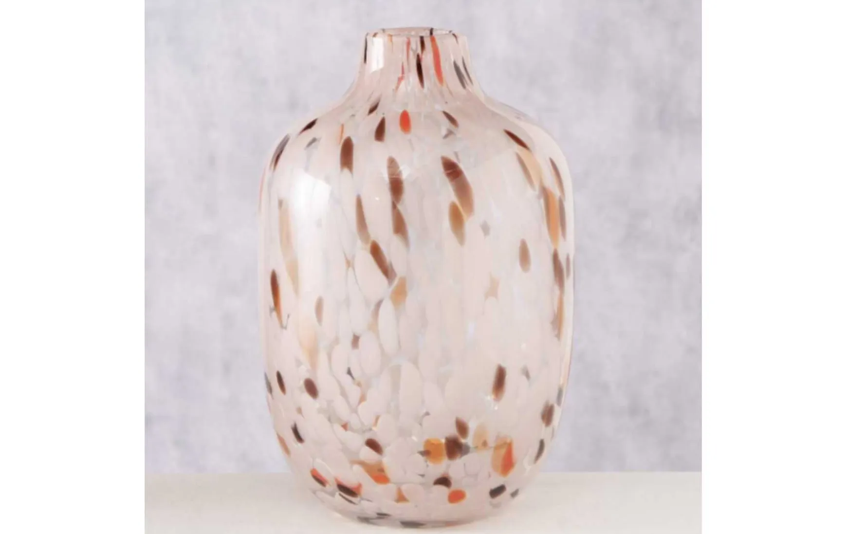 Diese elegante Glasvase mit rosa-beigem Punktmuster ist eine zarte und charmante Dekoration, die Ihrem Interieur einzigartigen Charme und Charakter verleiht. Mit seinem dezenten und dennoch auffälligen Design stellt dieses praktische Blumenarrangement Ihre Lieblingspflanzen wunderschön zur Schau oder ist eine schöne Dekoration für sich allein.