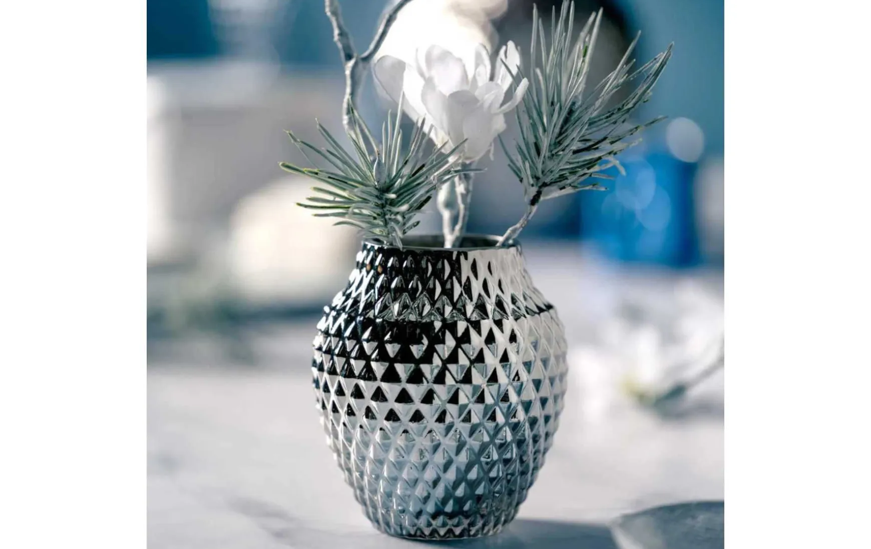 Das silberfarbene, verchromte Glas strahlt einen Hauch von Luxus aus und verleiht Ihrem Raum eine unvergleichliche Eleganz. Die besondere Oberflächenstruktur dieser Vase fängt das Licht ein und schafft faszinierende Reflexionen, die jeden Blick auf sich ziehen.