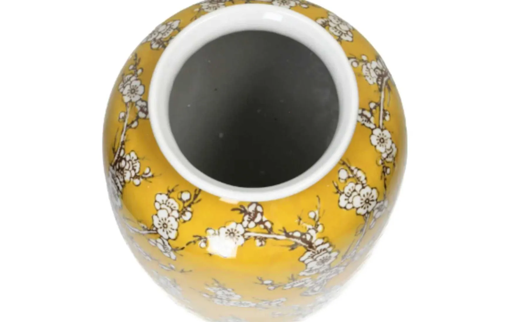 Mit dieser Vase im Farbton „China Gold“ holst du dir fernöstliches Flair in dein Zuhause. Sie ist aus hochwertigem Porzellan gefertigt und zeichnet sich durch das typische chinesische Blumenmuster aus. Dieses präsntiert sich in schwarz-weiß auf Goldgelbem Hintergrund.