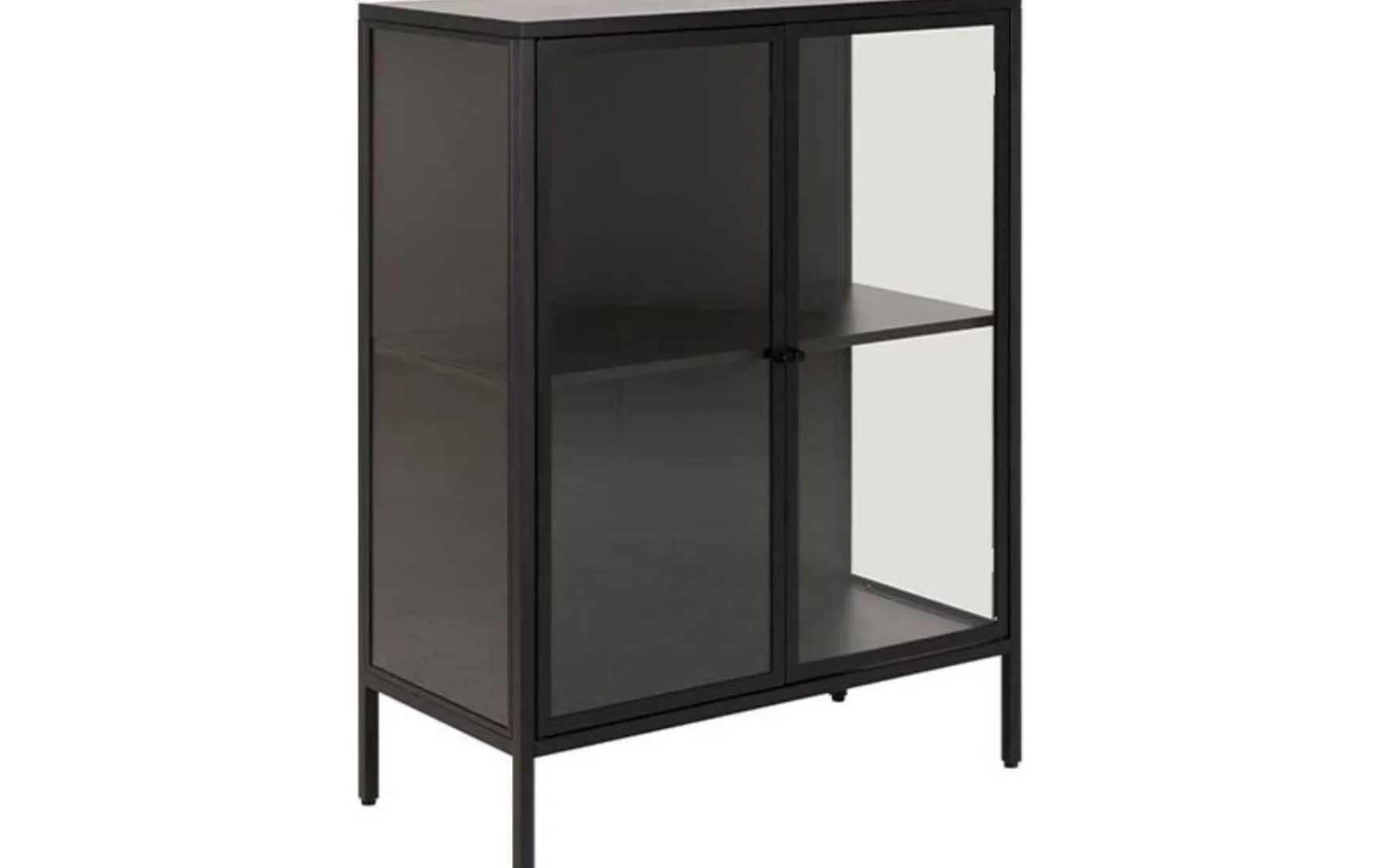 Die Vitrine im modernen Industrial-Design überzeugt durch ihre elegante Kombination aus schwarzem Metallgestell und matt schwarzem Korpus. Hinter den zwei Glastüren lassen sich Gläser, Geschirr oder Dekorationsstücke stilvoll präsentieren und gleichzeitig vor Staub schützen. Das schlichte, zeitlose Design passt ideal in Wohn- oder Esszimmer und setzt moderne Akzente in jedem Raum.