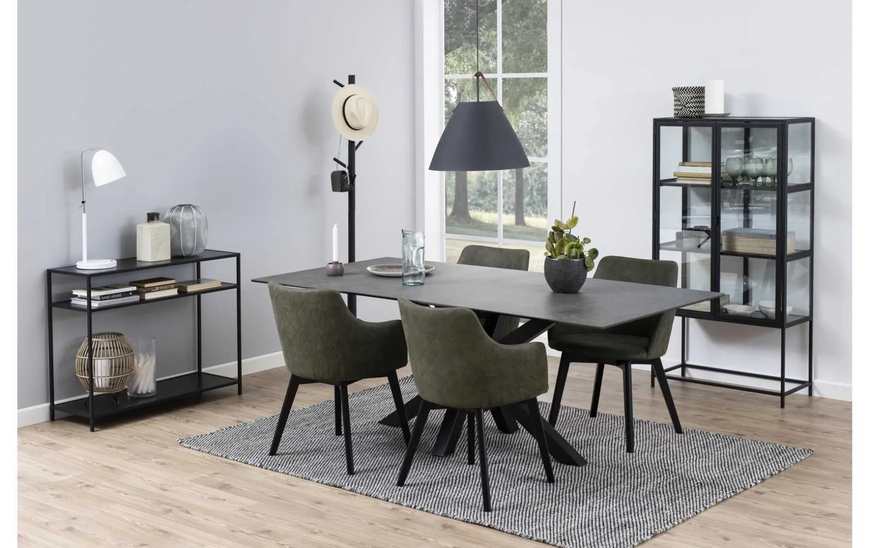 Diese moderne Vitrine in Esche Schwarz Dekor überzeugt durch ihr klares, zeitgemäßes Design und eine elegante Farbgebung. Das pulverbeschichtete Metallgestell in Schwarz verleiht der Vitrine Stabilität und einen industriellen Akzent, der sich harmonisch in moderne Wohnkonzepte einfügt. Mit einer Höhe von ca. 150 cm bietet sie ausreichend Platz zur stilvollen Präsentation von Deko, Geschirr oder Sammlerstücken. Die drei Einlegeböden sorgen für eine übersichtliche Aufteilung und flexible Nutzungsmöglichkeiten. Ideal für Wohn- oder Essbereiche, in denen Design und Funktionalität gefragt sind.