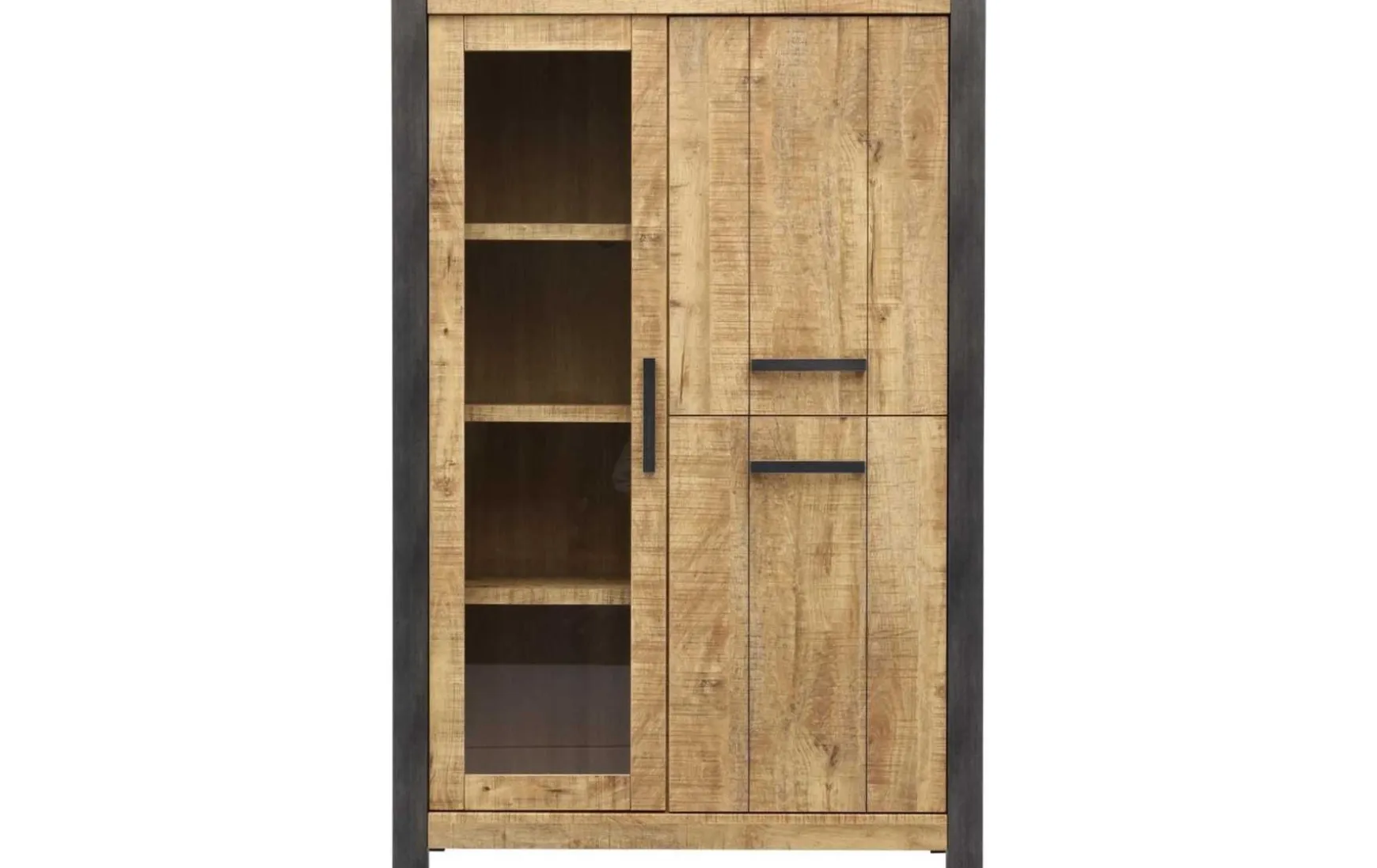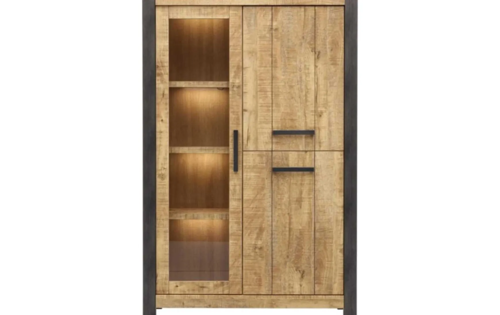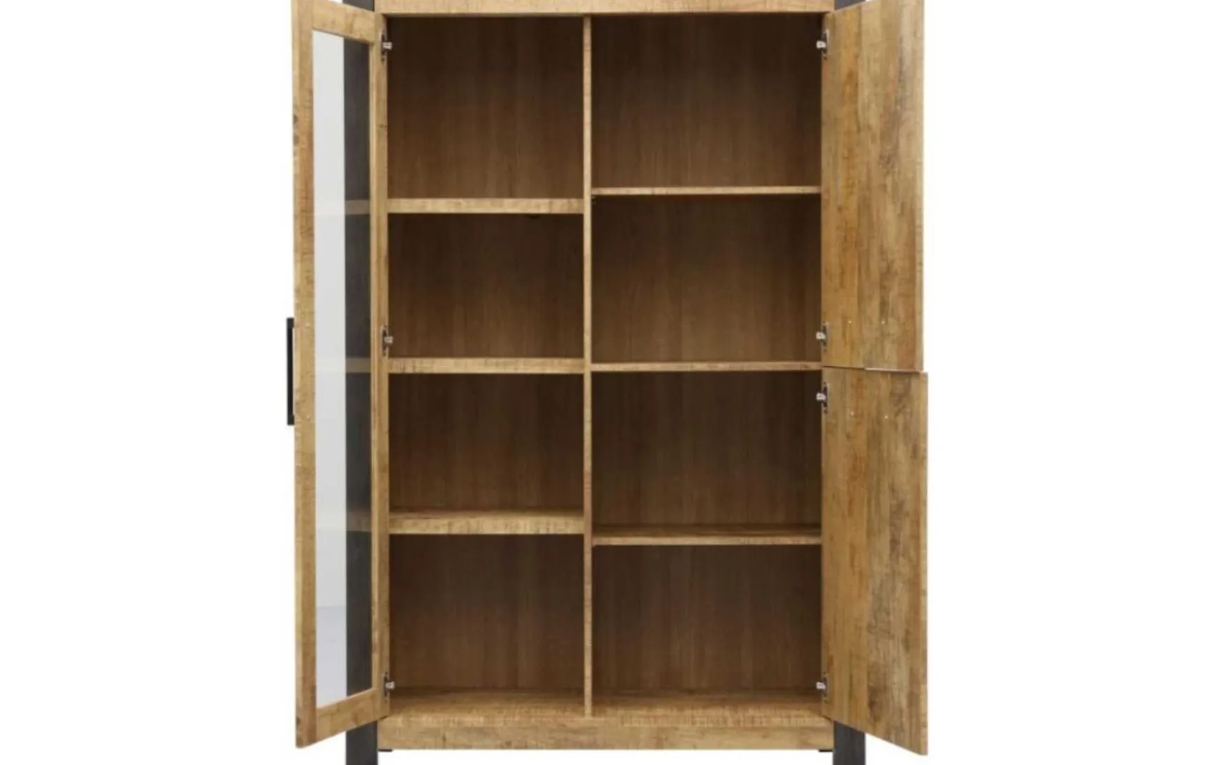 Die Vitrine ist im leichten Industriestil inklusive stimmungsvoller Beleuchtung im Glassteilt. Sie ist auch ein idealer Aufbewahrungsschrank für dekorative Gegenstände. Die Vitrine ist 117 cm breit, 48 cm tief und ein nicht zu hoher Schrank von 180 cm. Die Glastür ist etwas schmaler. Und: Die 2 rechten Türen sind miteinander verbunden und lassen sich auf einmal öffnen. Im Schrank finden Sie 8 Fächer. Die Türen schließen dank Soft-Close sanft und geräuschlos.