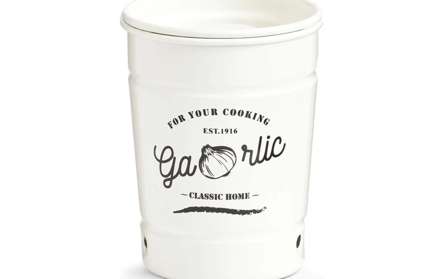 Diese Knoblauch-Vorratsdose aus Metall ist ein hilfreicher Wegbegleiter bei der anspruchsvollen Lagerung von Knoblauch. Sie sollte trocken und an einem dunklen Ort gelagert werden, dabei muss es aber immer noch genug Luft für die Zirkulation geben. Für dieses und weiteres Gemüse mit den gleichen Vorlieben eignet sich die Vorratsdose aus weißem Metall. Der Deckel ist abnehmbar und sorgt zusammen mit seitlichen Aussparungen dafür, dass sich keine Wärme stauen kann und ein natürlicher Austausch der Luft stattfindet. Durch ihren ansprechenden Druck ist die Vorratsdose gleichzeitig auch ein kleiner Hingucker in der heimischen Küche.