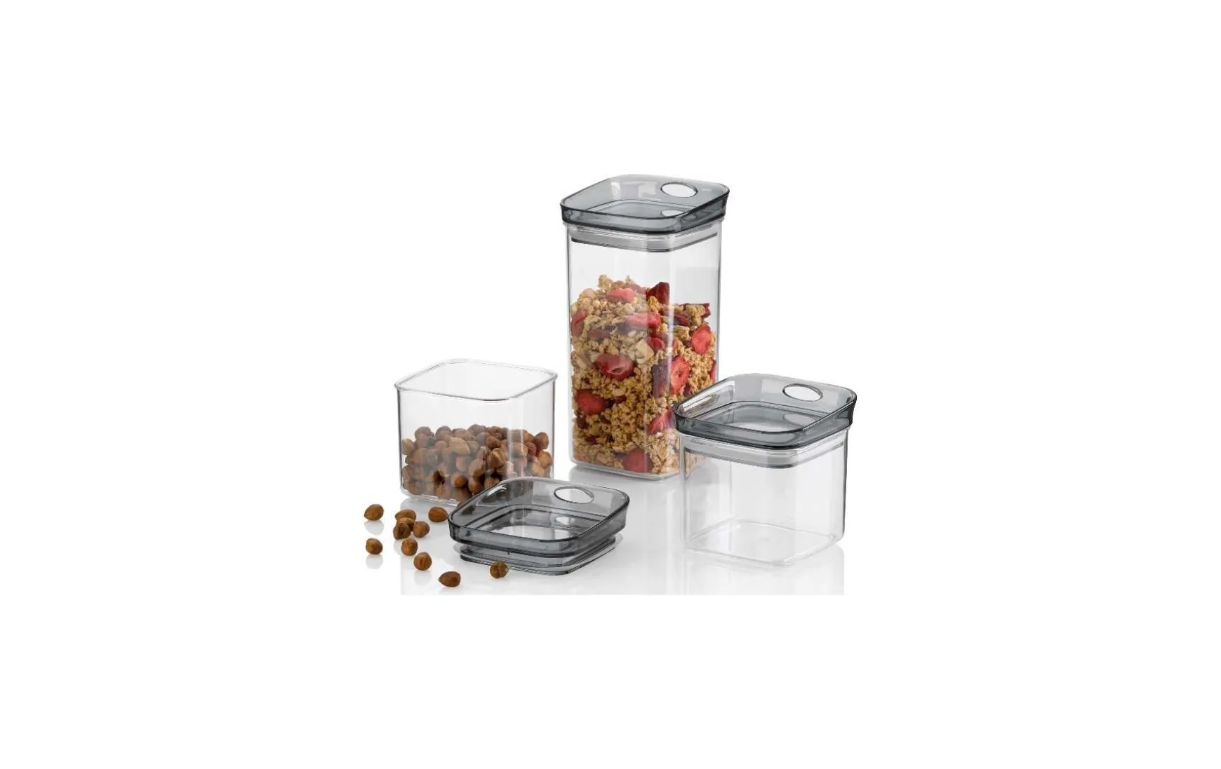 Das praktische, stapelbare Vorratsdosen Set aus Kunststoff. Diese transparente Vorratsdose ist eckig und es gibt sie in 4 verschiedenen Größen einzeln zu beziehen. Neu hinzugekommen ist diese dreiteilige Version. Diese Dosen sind ebenfalls transparent. Auffällig ist jedoch bei dieser Set-Variante der Grauschimmer bei den Deckeln. Der besondere Clou für eine platzsparende Aufbewahrung: Diese Dosen lassen sich luftdicht verschließen und stapeln.