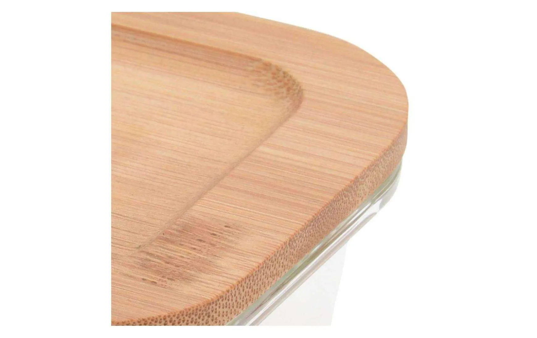Umweltfreundlicher Lebensmittelbehälter aus Borosilikatglas mit Bambusdeckel. Borosilikatglas ist hochgradig temperaturwechselbeständig, weist eine geringe Kratzfestigkeit auf und läuft nicht an. Der Deckel des Behälters besteht aus Bambusholz und ist mit einer Gummidichtung ausgestattet.
