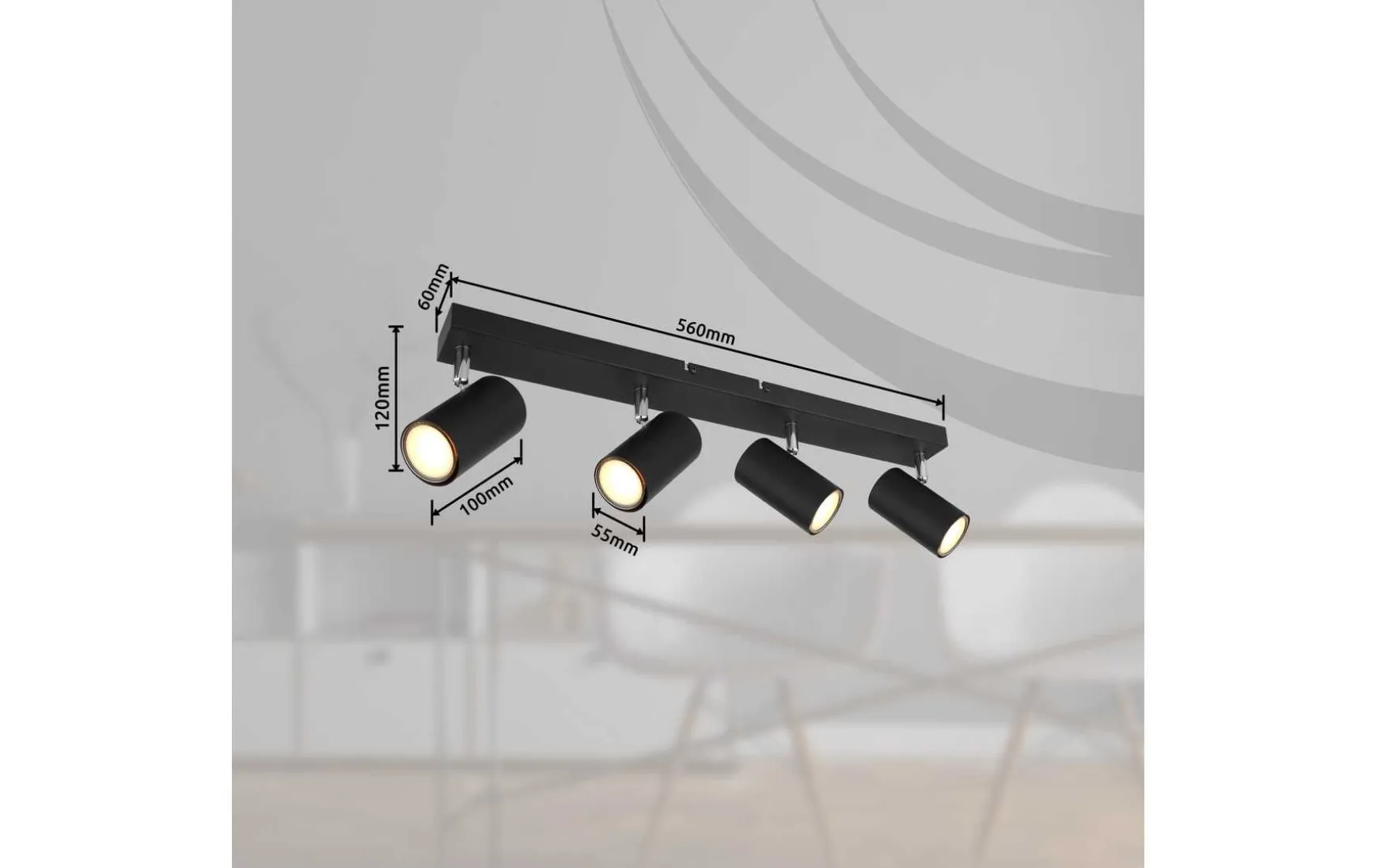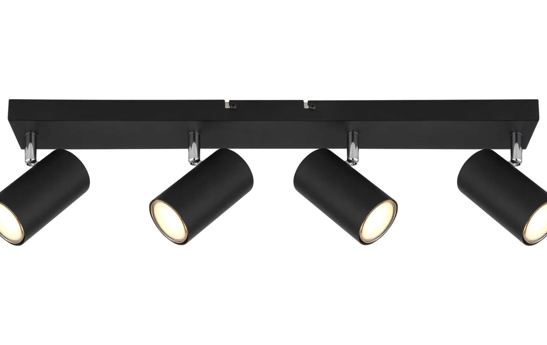 Dieser schlichte Strahler begeistert durch Design und Farbgebung. An einer schwarzen rechteckigen Deckenhalterung (56x6cm) befinden sich vier GU10 Fassungen, bedeckt von jeweils einem zylinderförmigen Schirm in matten Schwarz. Die GU10 Fassung, ermöglicht Ihnen die freie Wahl an Leuchtmitteln, bis zu einer maximalen Leistung von 35 Watt.