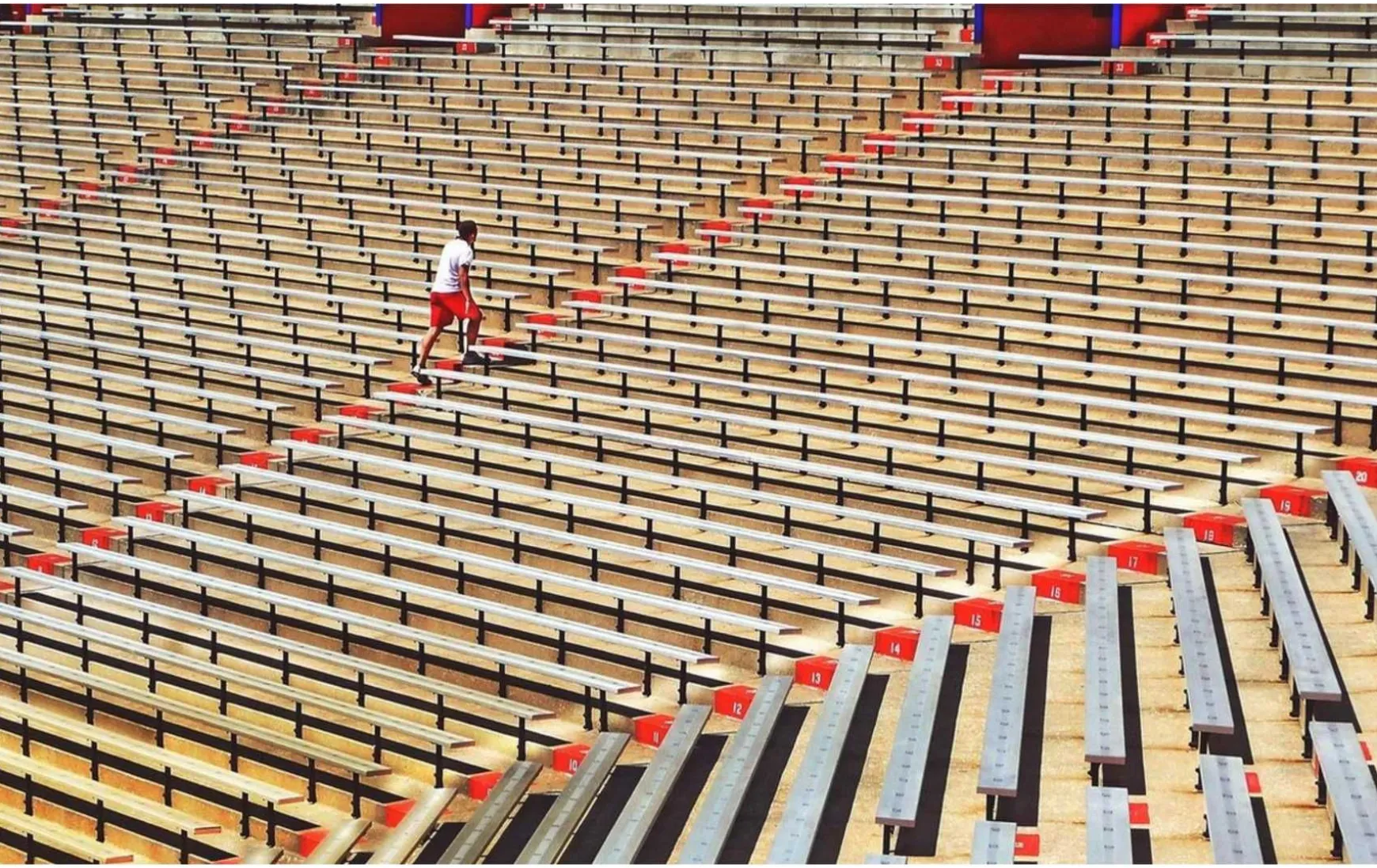 Architektur ist eine visuelle Kunst, und die Gebäude sprechen für sich. Rhythmus der Stadt: eine Tribüne mit blauem Stuhl und roten Treppen. Rhythm of the City: ist aus Edelstahl gefertigt. Das Gemälde wird mit einem blinden Aufhängesystem aus Kunststoff geliefert.