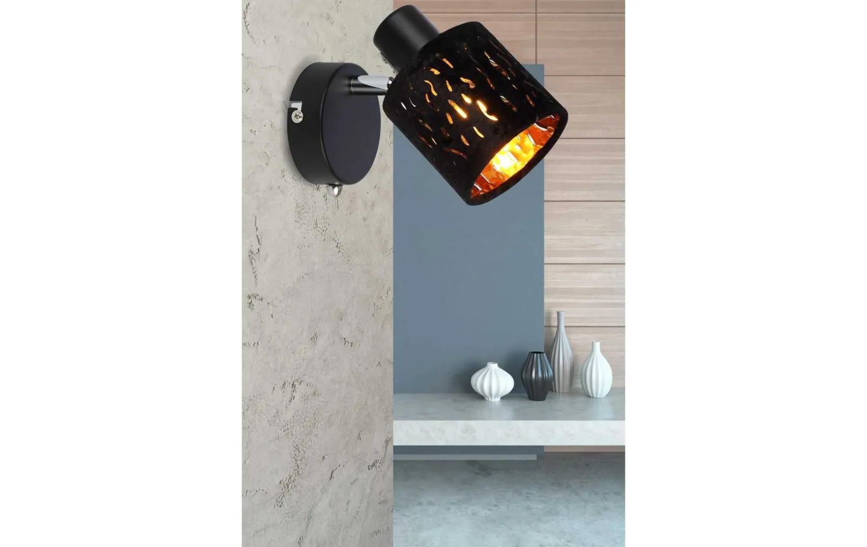 Das schwarze Metall der Halterung sowie einzelne verchromte Teile ergänzen das Bild und machen diesen Strahler zu einem wahren Hingucker.