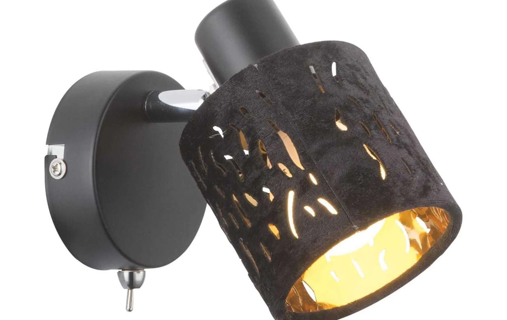 Dieser bewegliche und an einem starren Arm befestigten gestanzten zylinderförmigen Schirme dieses Strahlers sind mit schwarzem Samt überzogen, was wunderbar zur goldfärbigen Innenseite der Spots passt, die damit für ein wunderschönes Licht sorgen.