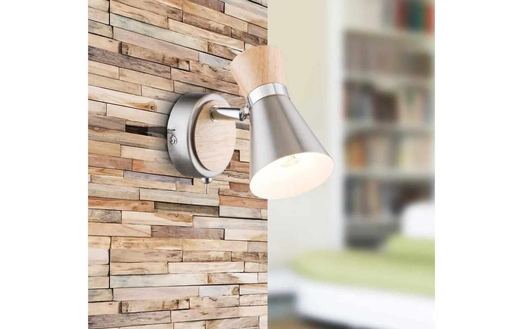 Dieser Wandstrahler überzeugt durch die Kombination aus Design und Verarbeitung. Die Materialkombination aus Holz, nickelmatten sowie verchromten Metall sorgt für eine tolle Optik.