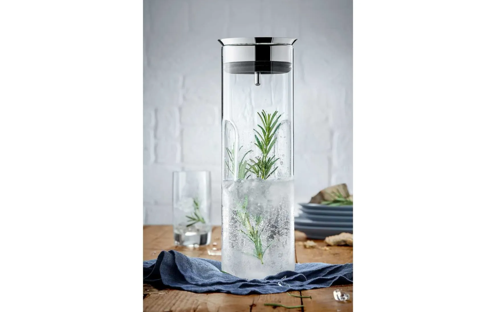 Dank praktischer Griffmulden liegt die Wasserkaraffe dabei ergonomisch perfekt in der Hand, der breite Flaschenhals erleichtert das Befüllen und Reinigen.
